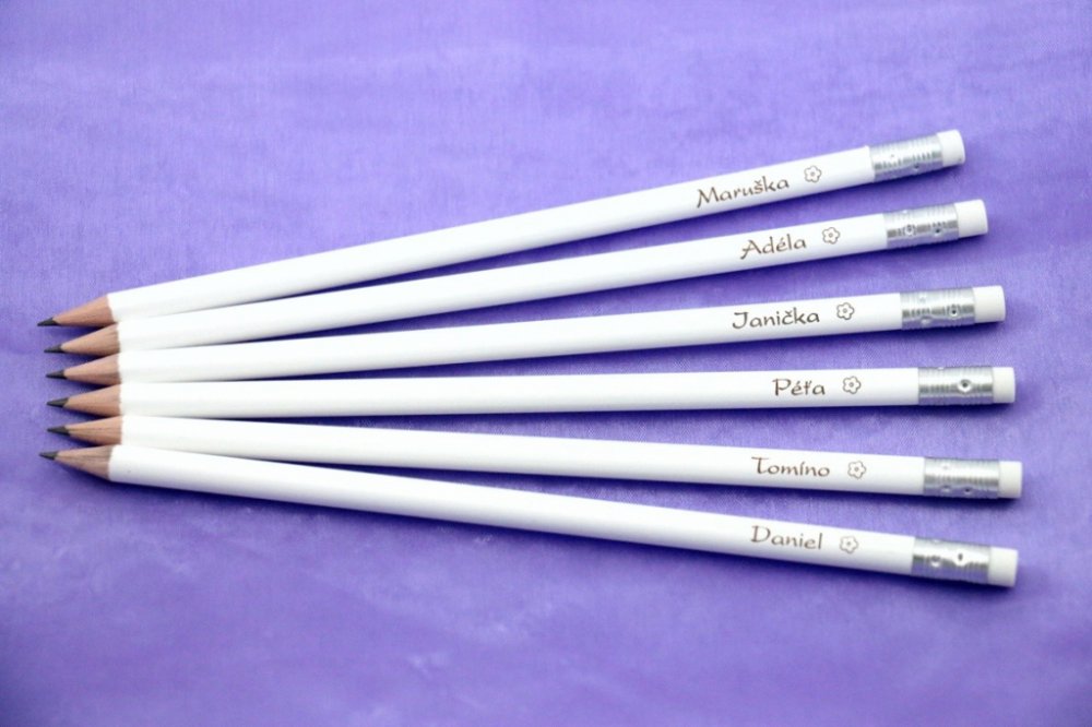 Dodáme Vám každou tužku s jiným jménem! Jmenovka i hezký dárek pro Vaše přátele a hosty, jak se patří.Originální svatební jmenovky v podobě kvalitní tužky vyrobené přímo v České republice s laserovým gravírováním s vysokým rozlišením. Žádný hrudkovitý lak a nečitelné a rozmazané písmo. Za naše svatební tužky se rozhodně nemusíte stydět. Tužky jsou již ořezané, s kvalitní bílou pryží a ihned připravené k použití.