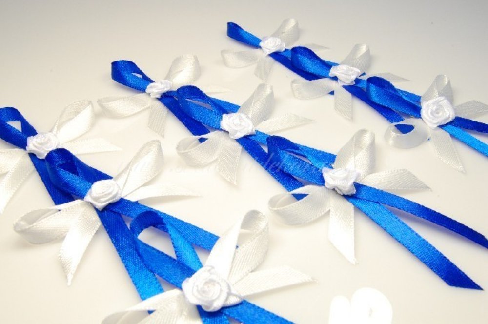 Svatební vývazky atlasové, s růžičkou - bílá, modrá (1 ks)