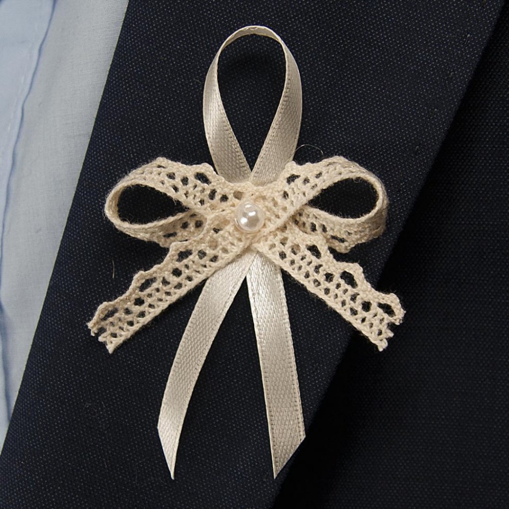 Svatební vývazky Naďa kola jsou kombinací atlasové stuhy a paličkované krajky ze 100% přírodní bavlny. Vývazek doplňuje perlička. Vývazky jsou určeny pro náročného zákazníka, který ocení 100% přírodní materiály. Připevňují se pomocí špendlíku do klopy saka nebo šatů.