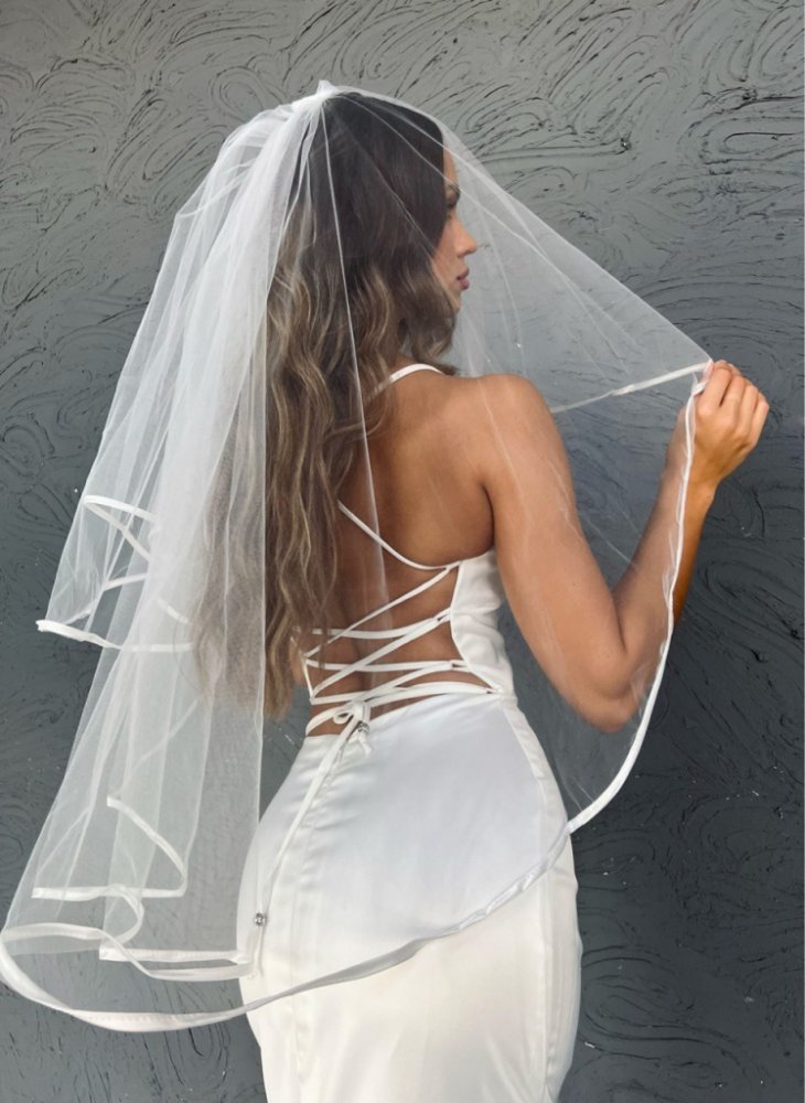 Dvouvrstvý závoj délky 200 cm v barvě off-white s atlasovým lemem na hřebeni. Osobitě se hodí k hladkým šatům (z atlasu, mikady nebo šifónu). Tato varianta je také oblíbená pro dámské večírky a kostýmovaná představení.
