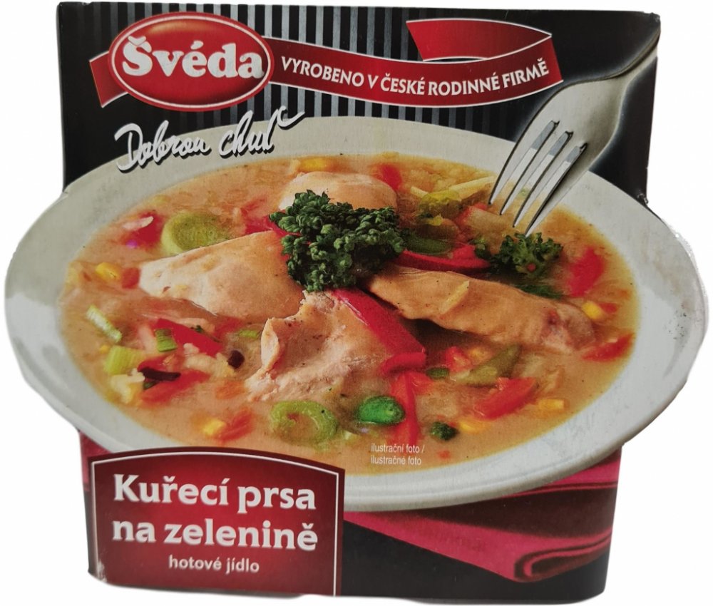kuřecí prsa 130g, směs zeleniny v různém poměru 100g (zelí bílé, mrkev, paprika žlutá, žampióny, pórek, paprika červená, cibule, hráškové lusky, čínská houba černá, pastinák, celer, brokolice, kukuřice), vývar (voda, kuřecí maso, vepřové kosti, cibule), pšeničná mouka, cibule, vepřové škvařené sádlo, směs koření a zeleniny (jedlá sůl, cukr krystal, mrkev, pastinák, cibule, petrželová nať , kurkuma, pepř černý mletý, vitamín B1 a B2, látky zvýrazňující chuť a vůni: inosinan sodný, guanylan sodný), tekuté ochucovadlo Maggi [voda, jedlá sůl, látky zvýrazňující chuť a vůni (glutaman sodný, 5´-ribonukleotidy sodné), ocet kvasný vinný, dextróza, kvasničný extrakt, aroma], jedlá sůl, kořenící přípravek (jedlá sůl, paprika sladká mletá, pepř černý mletý, kmín drcený, rozmarýn, oregano). Hodnoty hmotnosti uvedeny před tepelným opracováním.