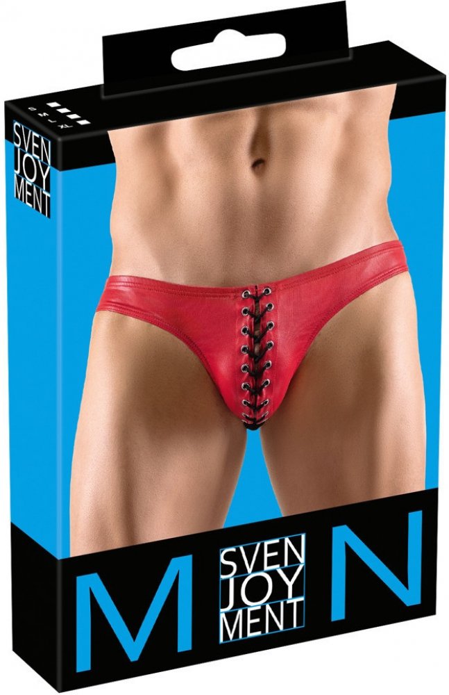 Svenjoyment - pánské spodní prádlo s černými tkaničkami (červené) Efektní pánské spodní prádlo z třpytivé látky, které je navíc zvýrazněno otevřeným předním provedením, kdy látku drží pohromadě pouze černý korzet, který umožňuje kůži mužského údu jemně vykukovat skrz rozparky! Proč je to dobré? Pružná, pohodlná tkanina - není jen na parádu Super efektní, lesklá látka - extra lesk Černý korzet s ot...