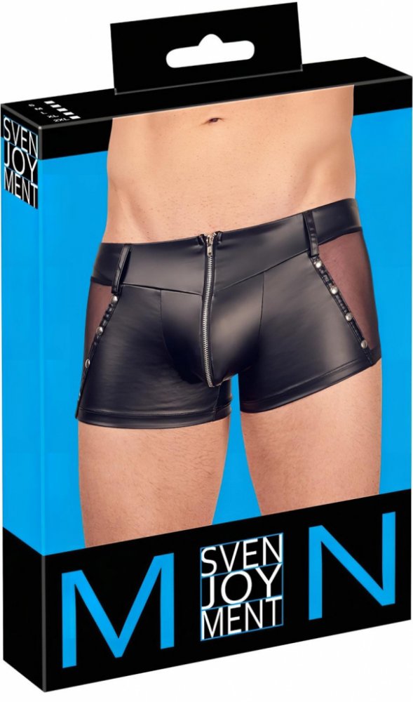Extrémně sexy boxerky s kovovými cvočky a průhlednými vsadkami, které v klidu obstojí i jako odvážné šortky! Proč je to super? Vizuálně výrazný, drsný designVelmi pružný, příjemný materiál - maximální pohodlíKovový zip vpředu uprostřed - snadný přístup pro spontánní akci nebo rychlou návštěvu toaletyKrátký, sexy střih - zvýrazní vypracovaná stehnaPrůsvitné síťované vsadky na obou stranách pro extra špetku erotikyZpevněné lemyPraktická poutka na pásek - můžeš nosit i s páskem jako stylové šortkySpecifikace produktu, vlastnosti: Velmi elastický, pohodlný materiálKovové ozdobné cvočkyPrůhledné síťované vsadky po stranáchKovový zip vpředu uprostředPoutka na pásek v paseBarva: černá, kovové části ve stříbrnéMateriál: 90% Polyester, 10% ElastanDoporučené čištění: Per ručně ve vlažné vodě s jemným pracím prostředkem, nežehli, nesuš v sušičce.