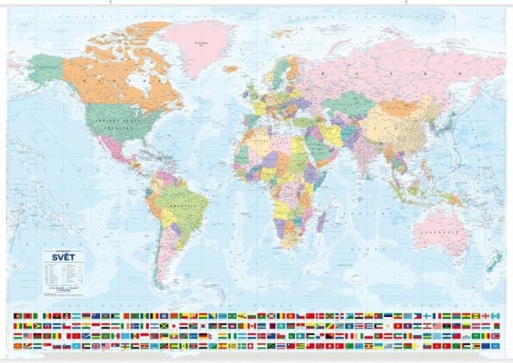 Ideální výzdoba každé kanceláře. Politické uspořádání států a závislých území celého světa, včetně všech hlavních a dalších významných měst. Mapa je doplněna vlajkami všech nezávislých států a rejstříkovými odkazy. Aktualizována byla v listopadu 2021.