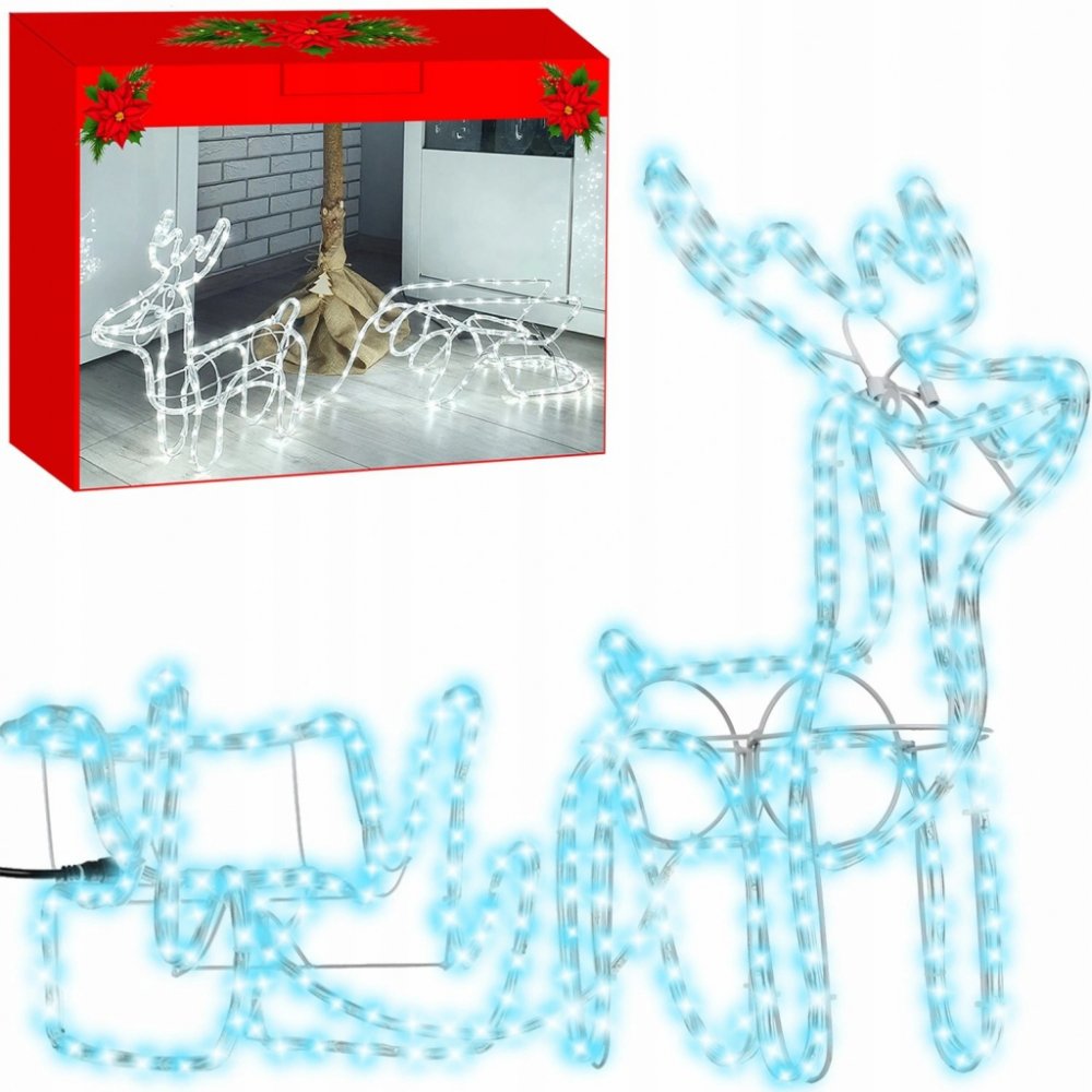 Specifikace: barva stálého světla: studená bílá pro použití: uvnitř výkon: 6W IP20 délka světelného řetězu: 11m délka napájecího kabelu: 1,5m počet LED diod: 204 ks. kovové kolíky pro připevnění k parožímRozměry: maximální délka soupravy: cca 128 cm délka soba: 45 cm šířka parohu: 20 cm maximální výška soba: 46 cm délka šňůry spojující soba se saněmi: 52 cm délka saní: 52 cm maximální šířka saní: 23 cm hmotnost: 1,416 kg hmotnost v balíku 1,959 kg