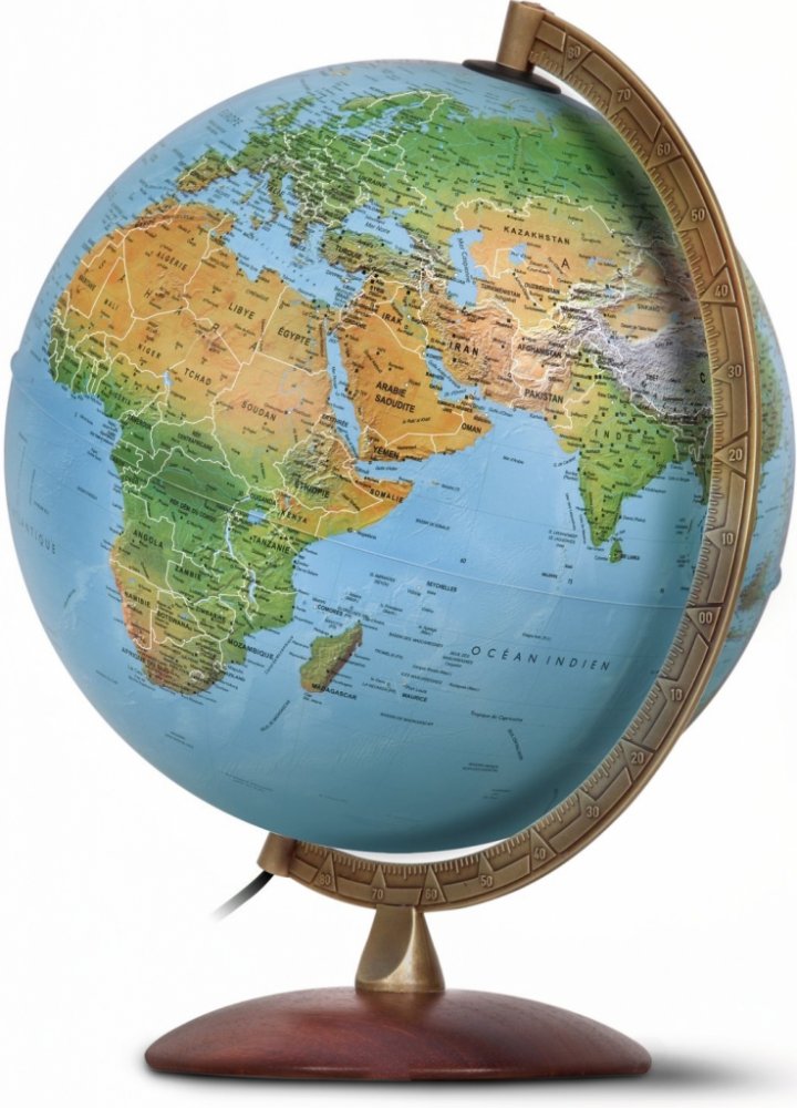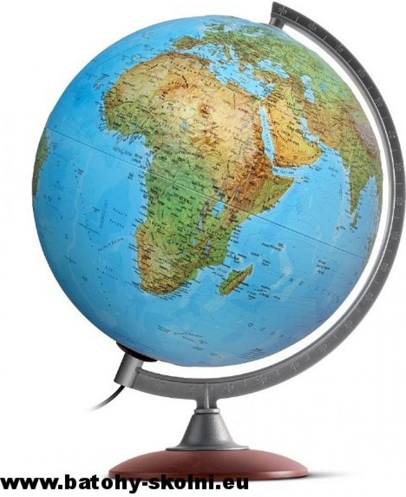 Elegantní reliéfní globus o průměru 30 cm poslouží jako názorná školní pomůcka, ale hodí se i na pracovní stůl. Kromě barevné hypsometrie je výškopis zvýrazněn plastičností a to celkem výrazně. Popis v českém jazyce, po rozsvícení se zvýrazní barevné politické rozlišení států. Podstavec je dřevěný, rameno kovové. Žárovka se mění vrchem po vysunutí ramena - návod je přiložen, náhradní žárovka není ...