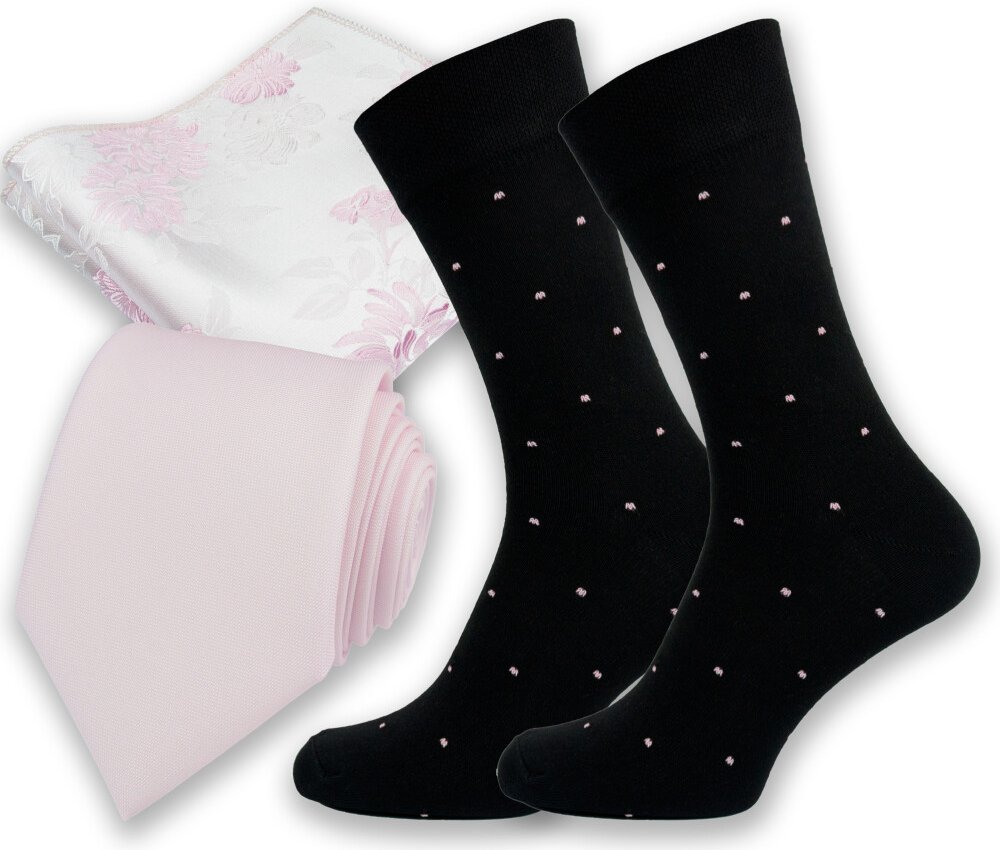 Vlastnosti setu:• Kravata – šířka 7 cm, světlounce růžová barva s jemnou strukturou• Kapesníček – rozměr 26 × 26 cm, bílý s jemným světlounce růžovým květinovým motivem• Ponožky – velikost 43–46, černý základ s drobnými světlounce růžovými puntíky• Perfektně ladí se šedým, béžovým, modrým i černým oblekem• Jednotlivé doplňky jsou baleny zvlášť v elegantních dárkových krabičkách
