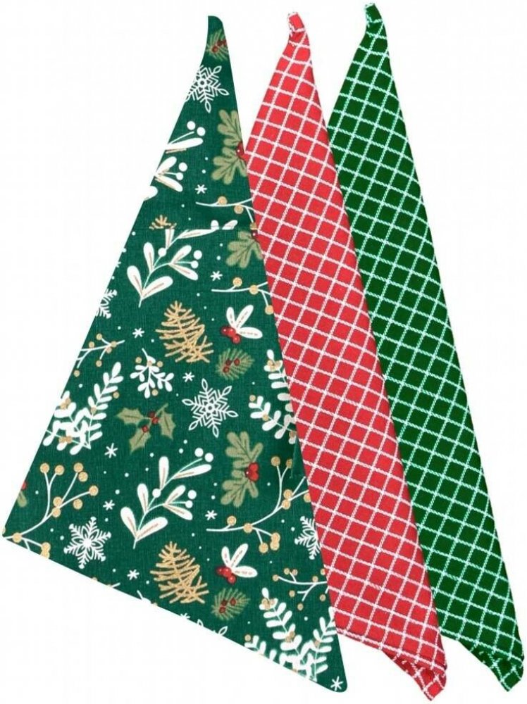 Sada vánočních utěrek Větvičky 25800 vnese do vaší kuchyně kouzelnou zimní atmosféru. Set obsahuje jednu utěrku s krásným vánočním potiskem jehličí, větviček, bobulí, hvězdiček a šišek, jednu červenou utěrku s bílým kříženým káro vzorem a jednu zelenou utěrku s jemným bílým kárem. Tradiční kombinace červené, zelené a přírodních tónů je ideální pro advent i celé zimní období.