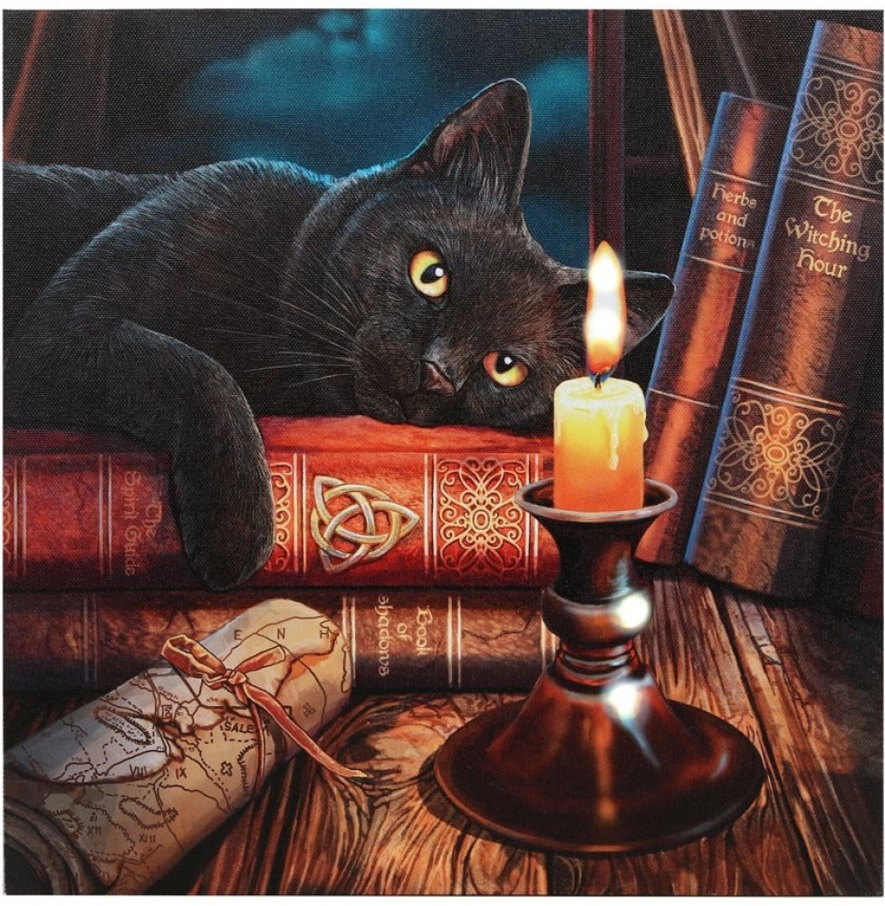 Fantastický obraz (plátno natažené na rámu, 30 x 30 cm) s motivem kočičky, svíčky a knihy od malířky Lisy Parker, se zabudovanými LED diodami - lze rozsvítit. Fantastický doplněk magické kočičí domácnosti.