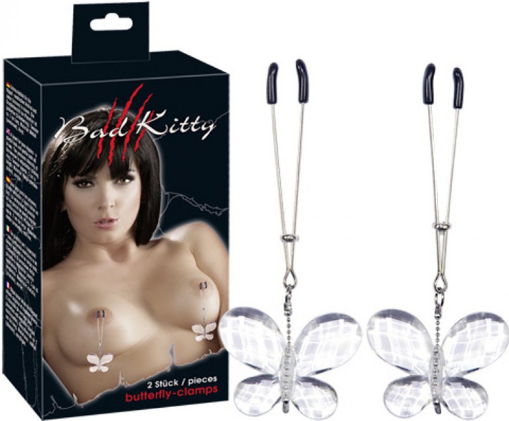 Vychutnejte si něžnou bolest na svých ňadrech. Svorky s motýlky od Bad Kitty bradavky krásně ozdobí a zároveň rozkošně potrápí. Svorky jsou vyrobeny z pochromovaného kovu a na koncích mají měkké gumové čepičky pro příjemnější nošení. Tlak můžete snadno nastavit posunutím kovového kroužku. Průhlední motýlci z akrylu ze svorek dělají unikátní šperk, který se bude při chůzi krásně pohupovat na prsou. TIP : Zkuste svorkami potrápit i jiné části těla, například stydké pysky.