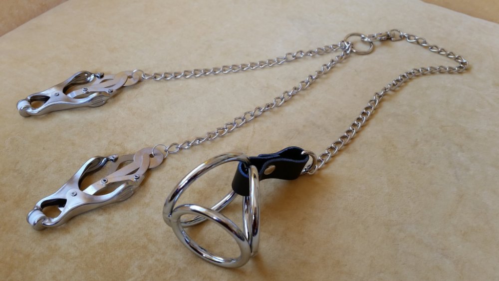 Návod: Penis se nagelovaný provlékne 2 způsoby a to buď 2 kruhy dle Vaší velikosti nebo "trojúhelníkem" mezi 3 kruhy. Varlata se neprovlékají. Délku lze nastavit karabinkou na řetízku ve spodní části. Stisk je poměrně silný a nelze regulovat, ale lze si ulevit tak, že u malých bradavek chytnete s bradavkou i trochu tkáně okolo. Po 30 minutách uvolněte pro obnovení volného průtoku krve. Uvolněte bez prodlení při bolesti či ztrátě citu.