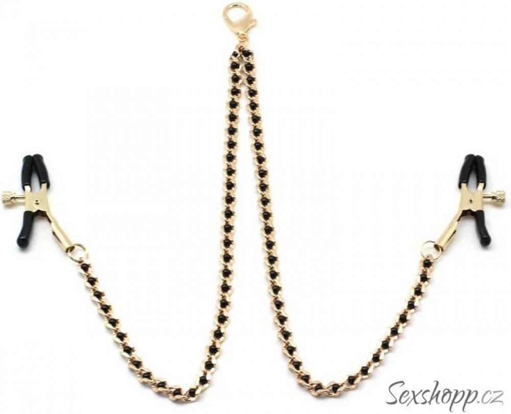Svorky mají řetízek zdobený černými perličkami. Uprostřed řetízku je karabinka, kterou můžete připnout k obojku. Mají jednoduché nastavení síly stisku pomocí aretačních šroubků a řetízek poskytne příjemný tah pro větší potrápení bradavek. Gumové čepičky zajistí pohodlnější nošení. Pokud si ale chcete užít bolestivější zážitek, můžete je sundat. TIP...