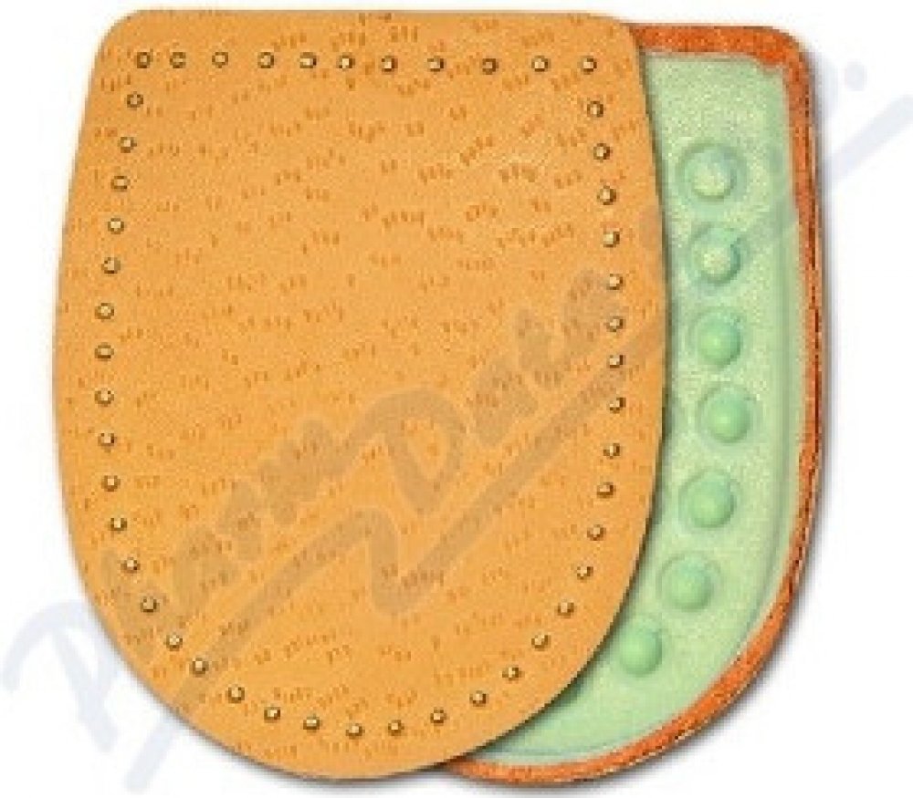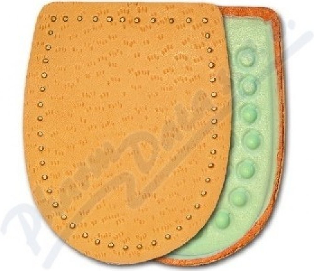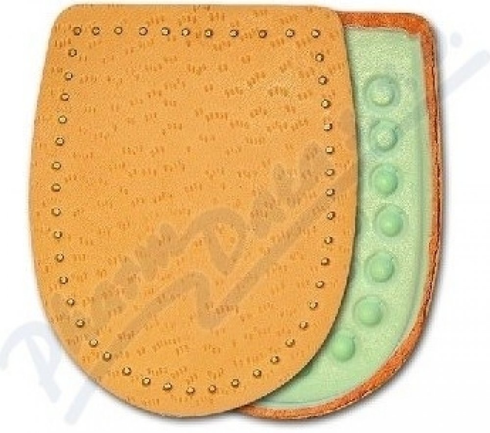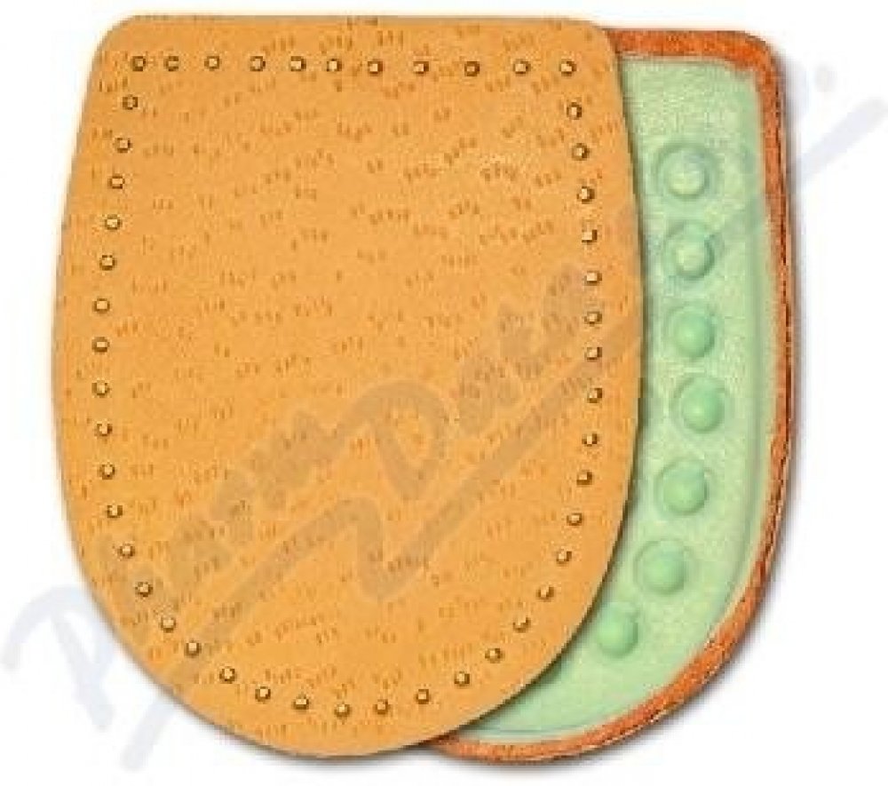 Odlehčí a změkčí bolestivý došlap při potížích s patní ostruhou. Tento nepříjemný výrůstek vzniká při opakovaném dráždění na patní kosti v místě úponu vazů, které zpevňují klenbu nohy. Podpatěnky tlumí nárazy a chrání před tlakem, který vzniká při došlápnutí. Vyrobeno z měkkého šlehaného latexu s odlehčením v místě patní ostruhy. Povrch je překryt měkkou jehněčí usní. Samolepicí pásek pro pevné uchycení podpatěnky. Pro velikost nohy 43-46. Hlavní vlastnosti: tlumí nárazy na patní kost při došlápnutí zmírňuje tlak na patní ostruhu změkčuje došlap Složení: Jehněčí useň, molitan, latexový výlisek. Použití: Připevněte do patní části obuvi pomocí samolepicí fólie. Používejte správnou velikost. Nepoužívejte současně s jinou podpatěnkou. Respektujte určení pro pravou a levou nohu. Upozornění: Pokud se léčíte s diabetem, konzultujte použití podpatěnek s lékařem.