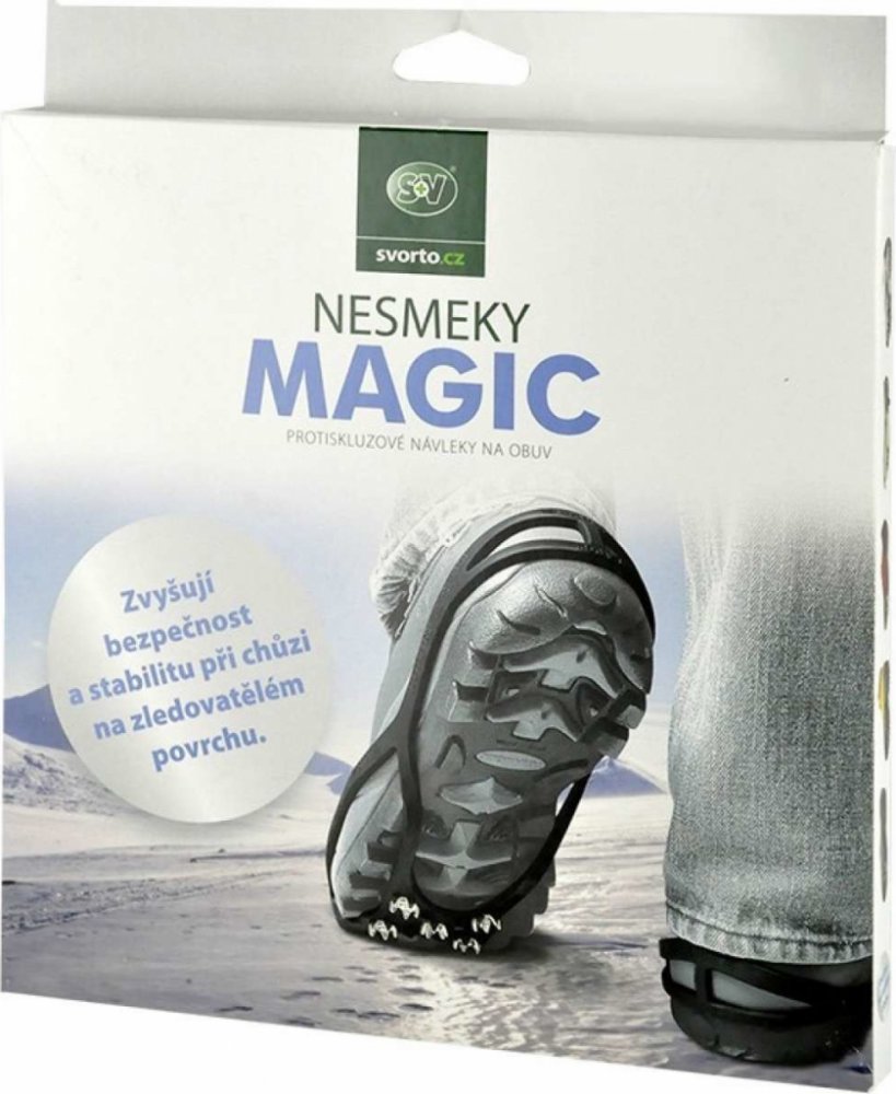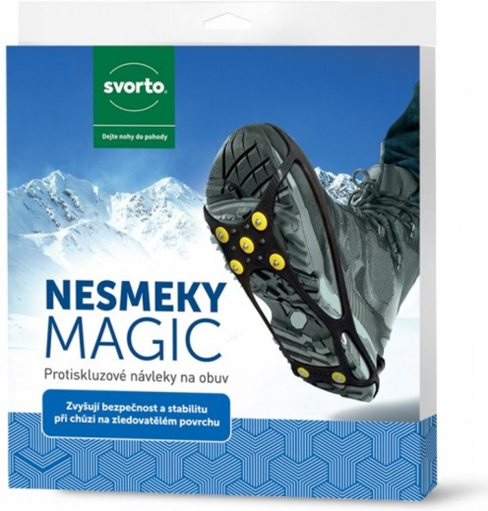 Máte obavy z chůze na zasněženém či zledovatělém povrchu? Skvělým řešením jsou nesmeky Svorto Magic! Návleky na obuv se snadno a rychle nasazují a díky kovovým hrotům pod špičkou i pod patou zvyšují stabilitu a bezpečnost chůze. Jsou vhodné pro vycházkovou i sportovní obuv. Doporučujeme vybranou velikost vyzkoušet z důvodu různých typů obuvi. Velikost 40-43.