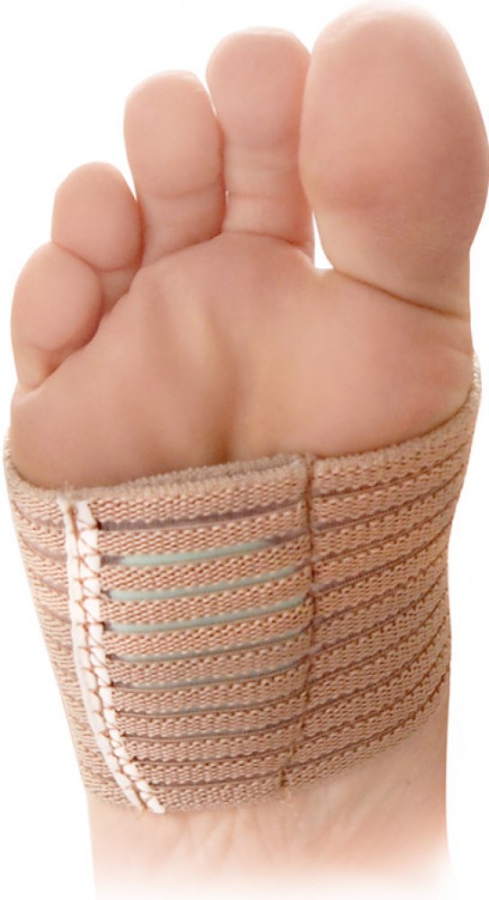 Bandáže stahují přední část nohy v místě prstních kloubů a podepírají příčnou klenbu latexovým srdíčkem.