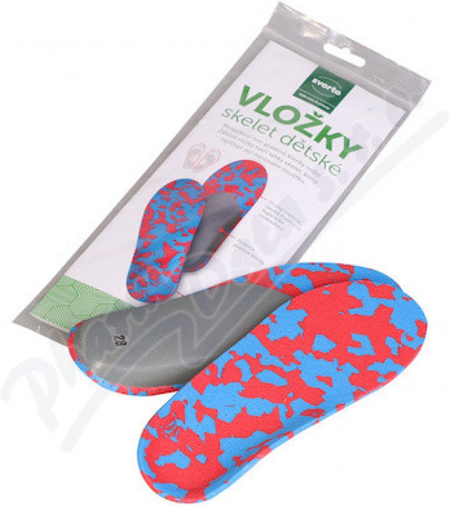 Vložky skelet dětské jsou tvořeny tenkým a pevným výliskem, který minimálně zmenšuje vnitřní prostor obuvi a podepírá podélnou klenbu. Zvýšeným vnitřním okrajem v patě pomůže vyrovnat dolní končetiny do správného osového postavení a zajistí stabilitu uložením paty do anatomicky tvarovaného lůžka. Krycí stélka je vyrobena z perforovaného materiálu EVA, který je oblíbený pro svou měkkost a omyvatelnost. Hlavním přínosem ortopedických vložek je, že rovnoměrně rozkládají tlak a váhu na plochu chodidla, odlehčují přetěžovaným místům a vyrovnávají postavení chodidel. Správná poloha dolních končetin je důležitá pro správné držení celého těla. Špatné osové postavení chodidel může negativně ovlivnit stav kolen, kyčlí i zad. Použitý materiál: materiál na bázi EVA, polypropylenový výlisek Výhody vložek Svorto Skelet Podpora podélné klenby Mírně anatomicky tvarované patní lůžko Ortopedicky tvarované Rovnoměrně rozkládají tlak a váhu na plochu chodidla Pružný plastový skelet pro přirozený pohyb chodidla Velikost a tvar lze upravit zastřižením ve špičce Velikosti 21 = 141 mm 22 = 146 mm 23 = 153 mm 24 = 160 mm 25 = 167 mm 26 = 174 mm 27 = 180 mm 28 = 188 mm 29 = 195 mm 30 = 201 mm 31 = 207 mm 32 = 213 mm 33 = 221 mm 34 = 226 mm 35 = 233 mm Naše benefity Diagnostika klenby zdarma Jsme autorizovaný prodejce značky Svorto Zázemí specializovaných kamenných prodejen Odborné poradenství