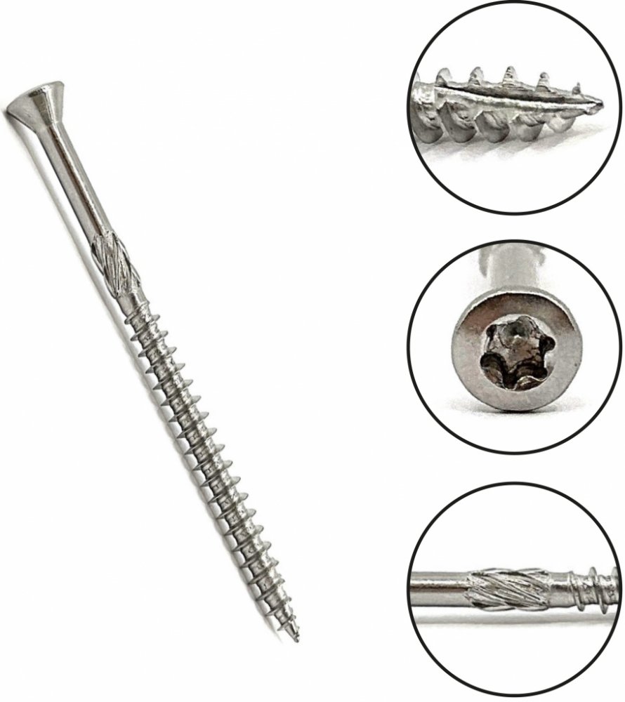 Terasové vruty z nerezu A2 velmi dobře odolávají korozi. Jde o nejčastěji používaný nerezový vrut, který je vhodný i na montáž dřevěné terasy, na montáž terasy z akátu nebo na montáž dubových desek. Nerezové vruty je rovněž možné použít k montáži odvětraných fasád ze dřeva. Najdou uplatnění při kotvení exteriérových obkladů nebo dřevěných fasád. Vruty j...