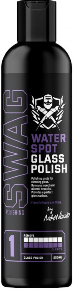 SWAG Water Spot Glass Polish - Leštící pasta na sklo (250ml) je vysoce účinný produkt navržený pro odstranění tvrdohlavých minerálních usazenin a vodních skvrn z povrchu skla. Tento pokročilý přípravek je ideální pro přípravu skleněných povrchů před aplikací hydrofobních povlaků, jako jsou tekuté stěrače nebo keramické ochrany. Jeho složení je speciálně vyvinuto pro profesionální detailingová studia, ale je vhodný i pro běžné uživatele, kteří chtějí dosáhnout dokonalého vzhledu skla.