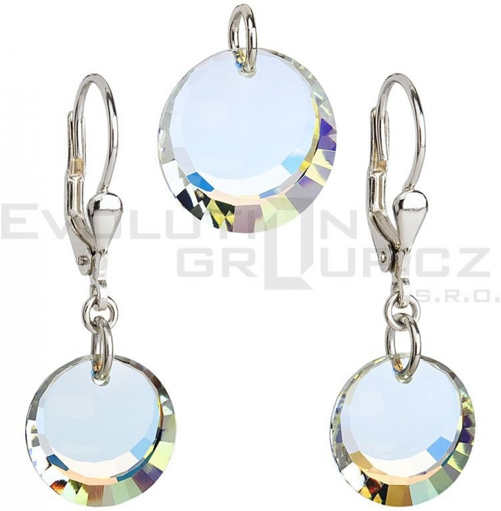 Souprava 39017.2 obsahuje visací náušnice a přívěsek ve stejném designu. Šperky jsou vyrobeny ze stříbra ryzosti 925/1000, které prošlo povrchovou úpravou rhodiem. Rhodium chrání šperk proti zčernání, zežloutnutí i poškrábání. Přívěšek i náušnice jsou zdobeny bílými Swarovski krystaly ve tvaru kulatého penízku. Krystaly disponují AB efektem, díky němuž na světle hází nádherné odlesky nejrůznějších barev. Náušnice mají zapínání na klapku. Jelikož šperky neobsahuji žádný přídavek niklu, mohou je bez obav nosit i alergici.