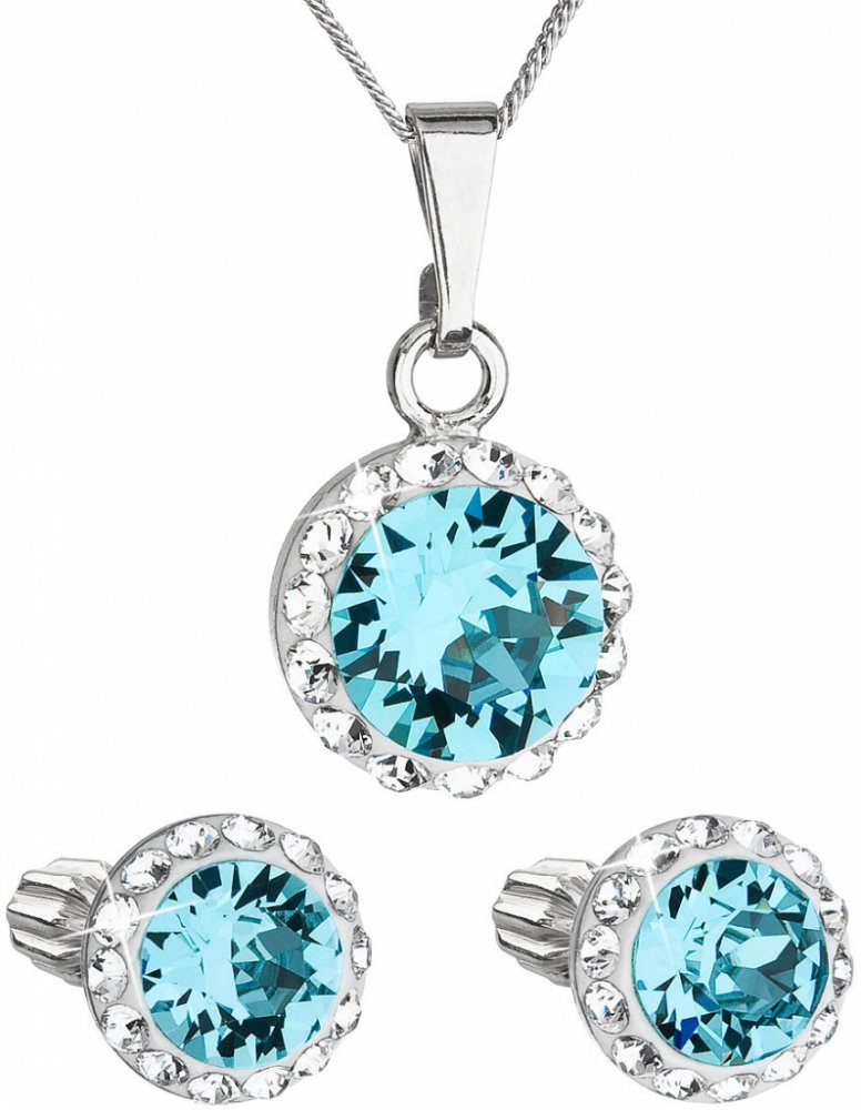 Sada 39352.3 obsahuje náušnice pecky a řetízek s přívěskem. Šperky jsou vyrobeny ze stříbra ryzosti 925/1000, které prošlo povrchovou úpravou rhodiem. Rhodium chrání šperk proti zčernání, zežloutnutí i poškrábání. Přívěšek i náušnice jsou zdobeny kulatým modrým Swarovski krystalem, který je navíc olemován ještě malými třpytivými Swarovski krystalky v bílé barvě. Náušnice mají zapínání na spolehlivý balónek. Jelikož šperky neobsahuji žádný přídavek niklu, mohou je bez obav nosit i alergici.