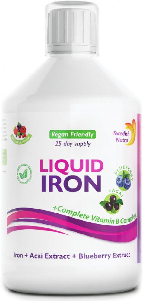 Swedish Nutra Iron Complex - tekutý doplněk stravy s příchutí bobulíTento jedinečný přípravek kombinuje 22 mg železa s vitaminy C, B1, B2, B6, B9 a B12, doplněný o extrakt z acai a borůvek pro jejich antioxidační účinek. Obsahuje také naši směs organického ovoce a bylin. Podporuje tvorbu a udržování červených krvinek Podporuje tvorbu hemoglobinu a energetický metabolismus Přispívá ke snížení únavy a normálnímu fungování kognitivních funkcí Posiluje imunitní systémProtože si tělo železo samo nevytváří, musí ho získávat z potravy. Jeho nedostatek je rozšířený a může vést k únavě, závratím nebo problémům se soustředěním - doplňky stravy mohou pomoci pokrýt potřebu.100% přírodní barva a chuťBez lepku a laktózy, veganskézásoba na 25 dní