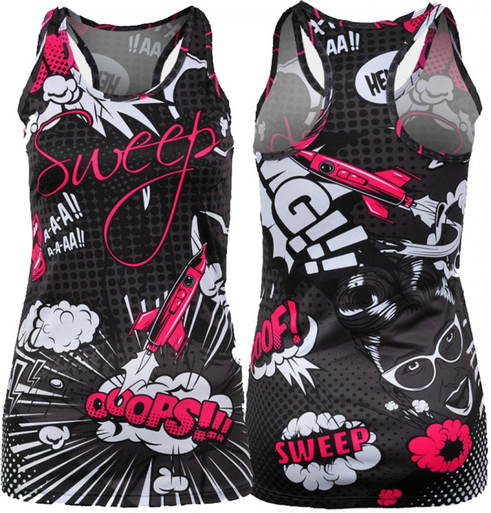 Komiksový motiv ovládá svět i ve sportovní módě. Funkční tílko SWEEP SWTS152 v jedinečném designu. Volit můžete v kombinaci bílé a černé nebo růžové, citronové a černé. Materiál je funkční plně přizpůsoben pro ty nejvyšší výkony. Záda jsou mezi lopatkami zúžená. Užší delší střih je spíše na tělo.