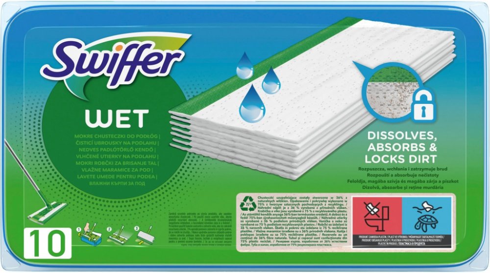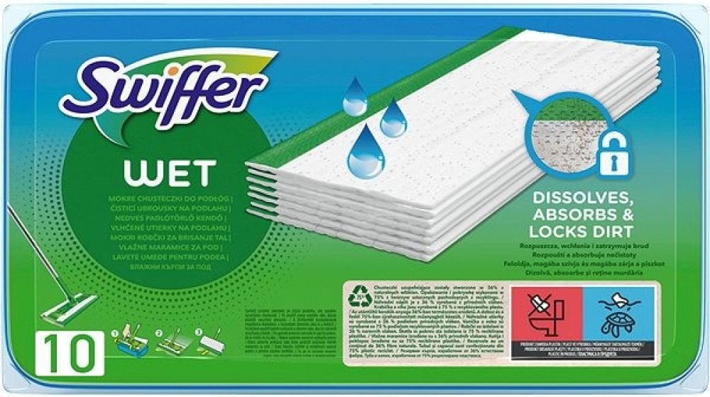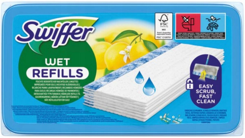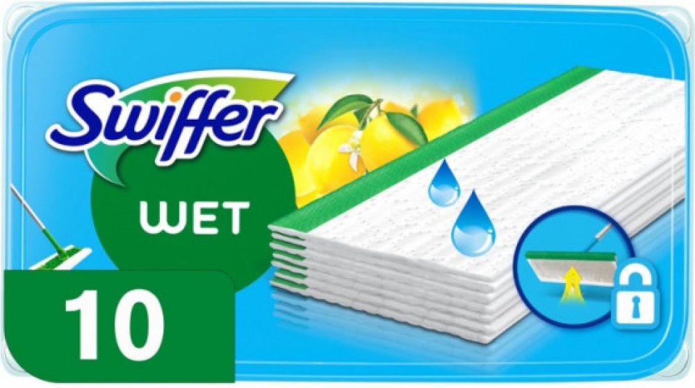 Vlhčené čistící ubrousky na podlahu Swiffer Vás spolehlivě zbaví nepříjemného prachu a nečistot z vaší podlahy se svěží vůní citrónu. Praktický pomocník víří mnohonásobně méně prachu než běžné prachovky. Zároveň prach magneticky přitáhne, tak aby čištěné povrchy byly důkladně osvobozeny od prachu, chlupů, vlasů a dalších nečistot, které uzamkne. Praktické a výhodné balení obsahuje 10 ks vlhčených náhrad. Uzamyká 3 x více prachu než běžné prachovky.POUŽITÍ:Vyndejte náhradu z obalu a nasadně na rukojeť.UPOZORNĚNÍ:Uchovávejte mimo dosah malých dětí. Balení neobsahuje mop, ale pouze prachovky. Nesplachujte použité prachovky do WC.ŽIVOTNÍ PROSTŘEDÍ:Zcela prázdný a čistý obal je možné recyklovat. Třídění odpadu má smysl.