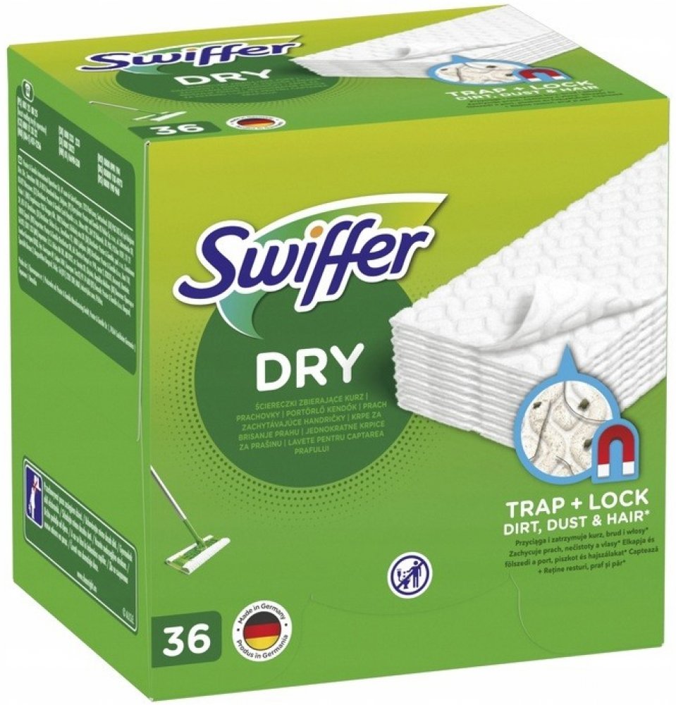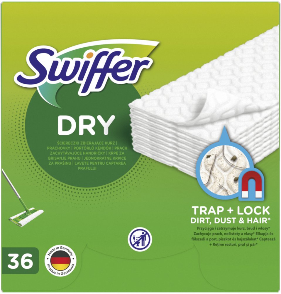 Sada Swiffer Dry Starter Kit je řešením pro čištění podlah na sucho. Ubrousek během chvilky zachytí prach a chlupy z jakékoli podlahy nebo jiného povrchu v domácnosti, a to i na těžko přístupných místech, například pod pohovkou nebo pod postelí. Tloušťka utěrek a specifický vzor v kombinaci s jejich elektrostatickým účinkem umožňují setřít a zachytit prach 3x lépe než tradiční smeták a zanechají v místnosti dlouhotrvající svěžest. Swiffer Dry vám umožní obnovit čistotu vaší domácnosti rychle, bez námahy a bez hluku. Věděli jste, že Sweeper je také kompatibilní s náhradními čisticími ubrousky Swiffer Wet? Utěrky představují jedinečné řešení, které rozpouští odolné skvrny, nečistoty a špínu, odstraní je z podlahy a absorbuje je hluboko do utěrky. Díky tomu vaši podlahu uklidíte opravdu rychle. Drsnější modrý proužek vylepšuje čisticí účinek a usnadňuje odstraňování odolných skvrn. Swiffer Sweeper se právě stal nástrojem 2v1: na utírání prachu používejte suché prachovky a na mytí podlah náhradní čisticí ubrousky. Jsou vhodné pro použití také na dřevěné podlahy. Vlhčené čisticí ubrousky Swiffer Sweeper nepoužívejte na neupravené, naolejované nebo voskované dřevěné povrchy ani na nelepenou dlažbu nebo koberce. Pamatujte, že utěrku Swiffer lze použít na všechny tvrdé povrchy včetně voskovatelných a nevoskovatelných podlah linoleových, vinylových nebo keramických a upravených dřevěných podlah.