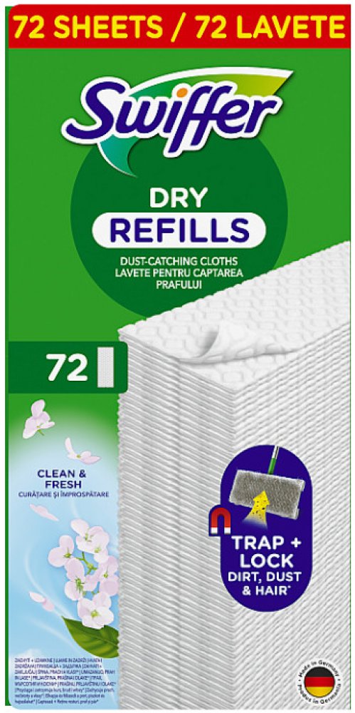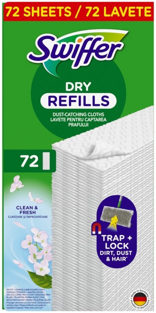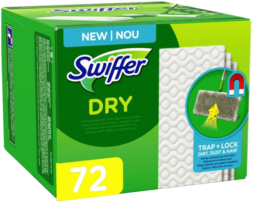 Swiffer náhradní čisticí ubrousky na podlahu se používají s násadou Sweeper pro zachycení nečistot, prachu a vlasů z jakéhokoli druhu podlah. Jsou 3krát účinnější než tradiční smeták. Ubrousky mají elektrostatický účinek, který v kombinaci s jejich pevností a specifickým vzorem umožňuje zachycení veškerého prachu. Můžete je také použít jako doplněk k vysavači pro zachycení nevysátého jemného prachu, nebo jako trik pro rychlé poklizení mezi důkladnými úklidy.