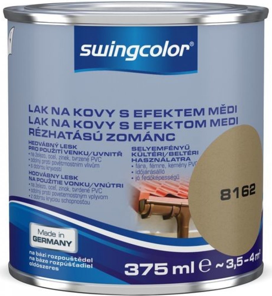 Barevný email swingcolor s efektem mědi o objemu 375 ml slouží jako lak na kovy, například ocel, železo, hliník a zinek, a barvou natírané tvrzené PVC v interiéru i exteriéru. Natřete s ním mechanicky nezatěžované plochy, jako jsou střešní okapy, dešťové svody, obložení, okenice, potrubí a další povrchy. Barva výborně kryje a po rychlém zaschnutí vytváří lesklou vrstvu, která účinně chrání proti korozi a zároveň dokáže efektivně odolat povětrnostním vlivům. Účinek měděného efektu se může barevně lišit v závislosti na vlastnostech podkladu.