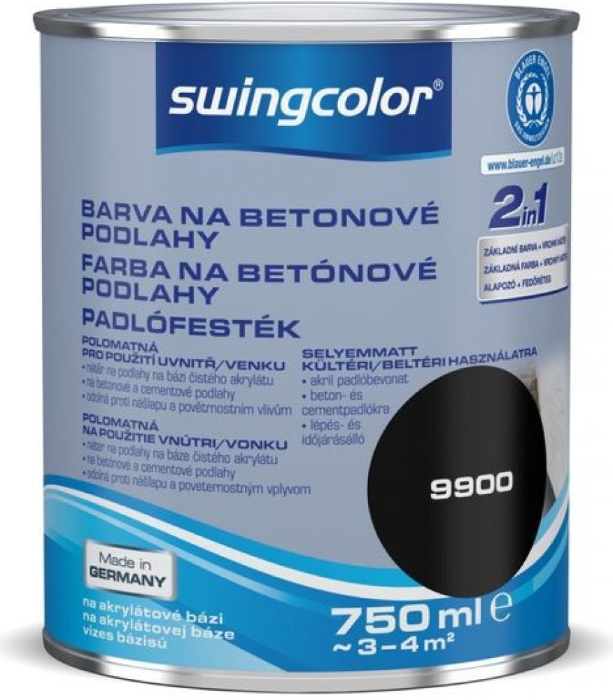 Speciální barva na betonové podlahy swingcolor 2 v 1 je hedvábně matný podlahový nátěr na vodní bázi pro betonové a cementové podlahy v interiéru i exteriéru. Je vhodná pro podlahy ve sklepích nebo dílnách, zastřešené terasy a balkony bez trvalého zatížení vodou nebo pro výstavní a skladovací prostory bez dopravního zatížení. Čistě akrylátový podlahový nátěr je rychleschnoucí a odolný proti opotřebení, pošlapání a povětrnostním vlivům. Pro protiskluzný účinek se mohou plochy natřít bezbarvým uzavíracím lakem swingcolor a protiskluznou přísadou swingcolor. Pro speciální vzhled je možné přimíchat dekorační chipsy swingcolor. Pro zvýšení životnosti můžete nátěr závěrem přetřít bezbarvým uzavíracím lakem swingcolor.