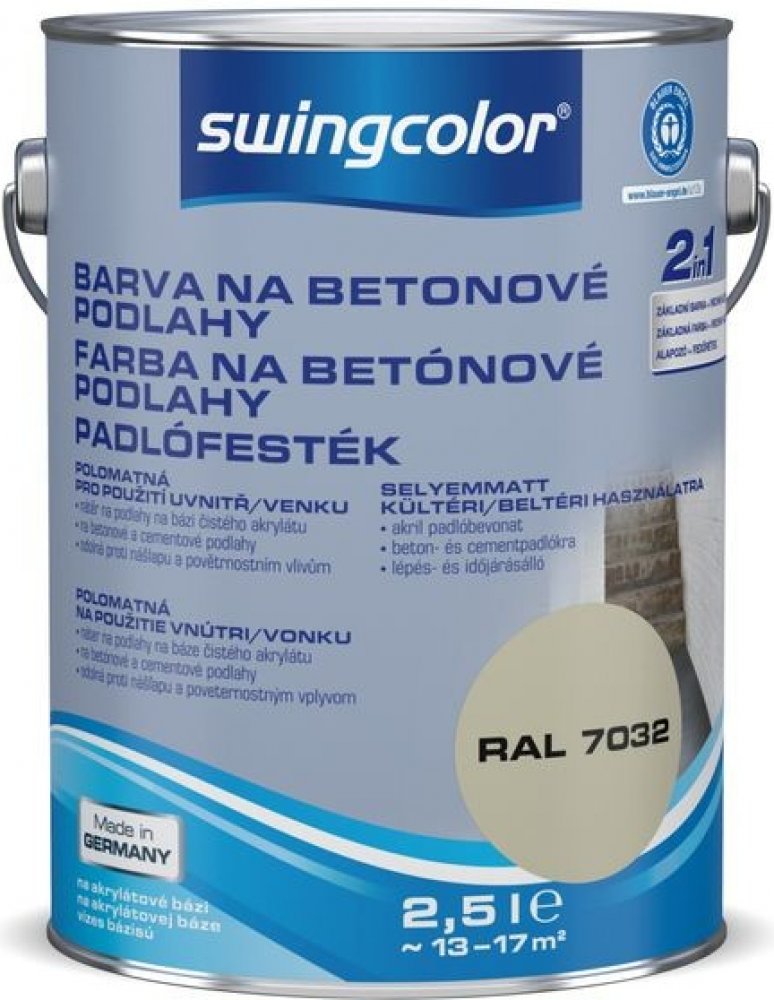Speciální barva na betonové podlahy swingcolor 2 v 1 je hedvábně matný podlahový nátěr na vodní bázi pro betonové a cementové podlahy v interiéru i exteriéru. Je vhodná pro podlahy ve sklepích nebo dílnách, zastřešené terasy a balkony bez trvalého zatížení vodou nebo pro výstavní a skladovací prostory bez dopravního zatížení. Čistě akrylátový podlahový nátěr je rychleschnoucí a odolný proti opotřebení, pošlapání a povětrnostním vlivům. Pro protiskluzný účinek se mohou plochy natřít bezbarvým uzavíracím lakem swingcolor a protiskluznou přísadou swingcolor. Pro speciální vzhled je možné přimíchat dekorační chipsy swingcolor. Pro zvýšení životnosti můžete nátěr závěrem přetřít bezbarvým uzavíracím lakem swingcolor.