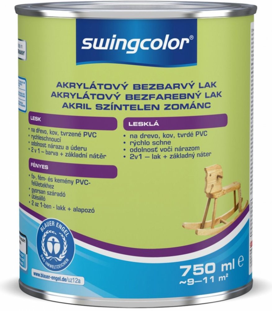 Bezbarvý lak Swingcolor 2 v 1 o objemu 750 ml je lesklý krycí lak na vodní bázi, odolný vůči povětrnostním vlivům a vyblednutí. Zároveň je odolný proti nárazům a úderům, rychle schne a snadno se zpracovává. Díky svým vlastnostem se může bezbarvý lak používat na různé podklady v interiéru i exteriéru. Bezbarvý lak nabízí optimální ochranu povrchu na plochách lakovaných barevnými emaily Swingcolor 2...