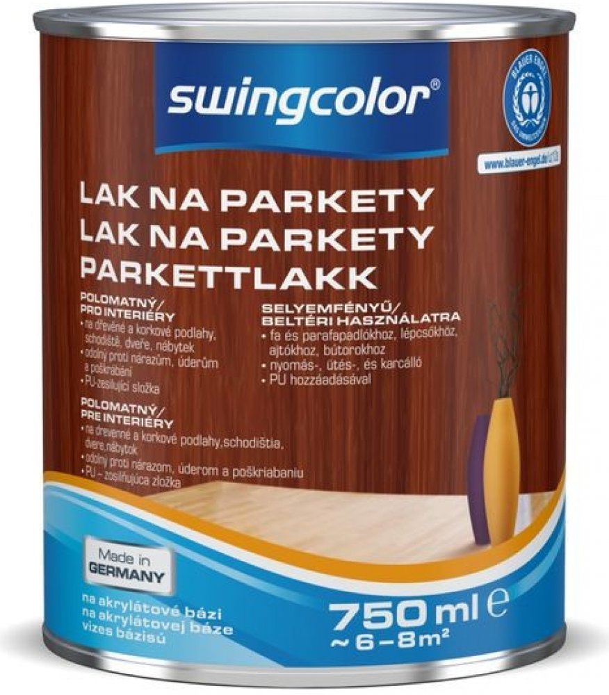 Bezbarvý lak na parkety swingcolor o objemu 750 ml na vodní bázi je určený pro uzavření dřevěných a korkových podlah, schodů, dveří a nábytku v interiérech. Je odolný proti nárazům, úderům a poškrábání i proti vyblednutí a čištění. Tento polomatný lak poskytuje ochranný a ošetřující nátěr pro nové i lakované parketové podlahy, prkna a jiné dřevěné podlahy. Lak je bez zápachu a lze jej ředit vodou....