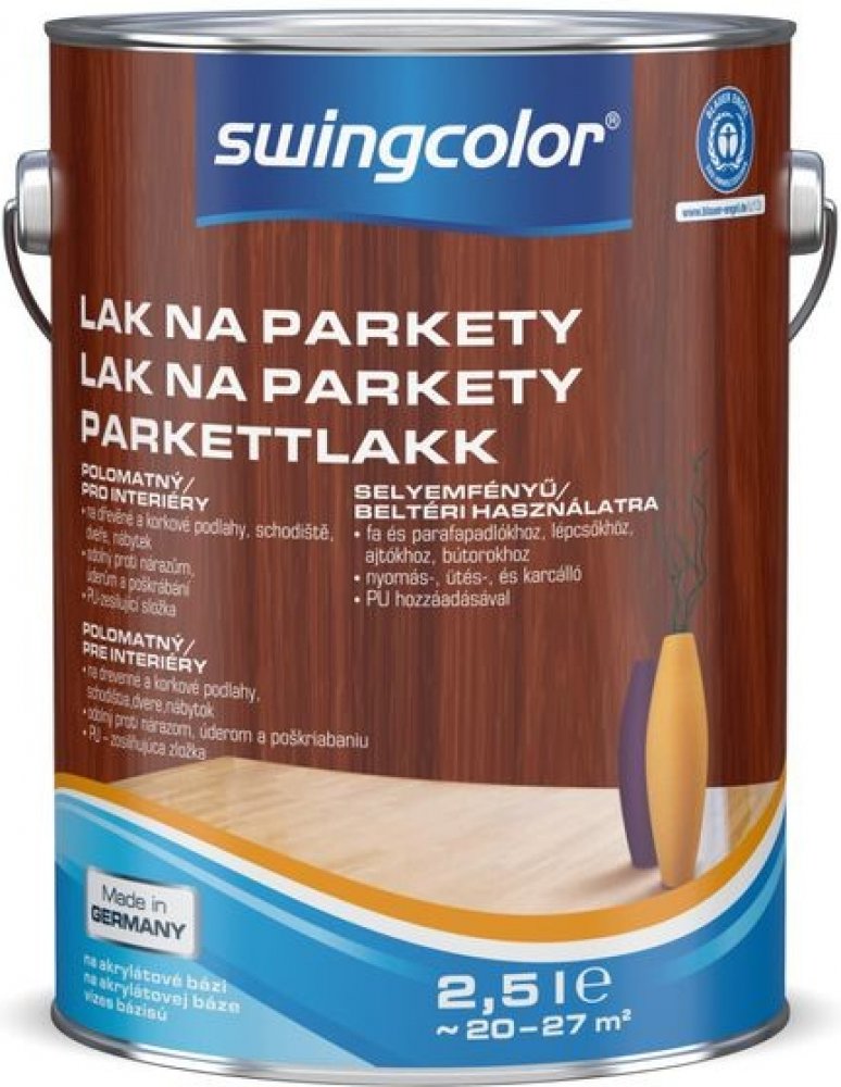 Bezbarvý lak na parkety swingcolor o objemu 2,5 l na vodní bázi je určený pro uzavření dřevěných a korkových podlah, schodů, dveří a nábytku v interiérech. Je odolný proti nárazům, úderům a poškrábání i proti vyblednutí a čištění. Tento polomatný lak poskytuje ochranný a ošetřující nátěr pro nové i lakované parketové podlahy, prkna a jiné dřevěné podlahy. Lak je bez zápachu a lze jej ředit vodou. ...