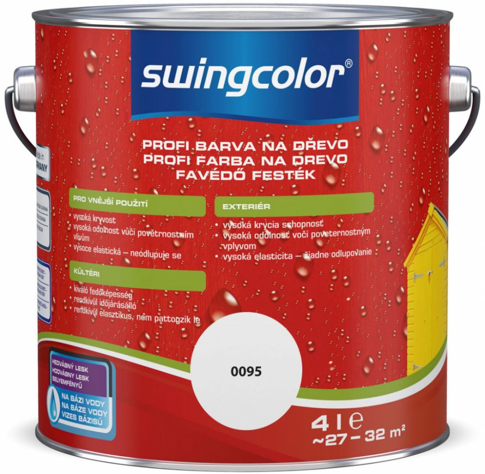 Swingcolor PROFI je barevný email na vodní bázi vhodná pro použití ve vnějším prostředí především na dřevo, hodí se však i na kovy vč. zinku a pozinkované plochy a tvrdé PVC. Je vysoce elastický, odolný proti povětrnostním vlivům, má výborné krycí schopnosti a je paropropustný. Pro zabránění prorážení látek obsažených ve dřevě doporučujeme izolační nátěr podkladovou barvou Swingcolor. Při používání prostředků na ochranu dřeva je třeba dbát zvýšené opatrnosti. Před použitím si prosím vždy přečtěte etiketu a informace o produktu.
