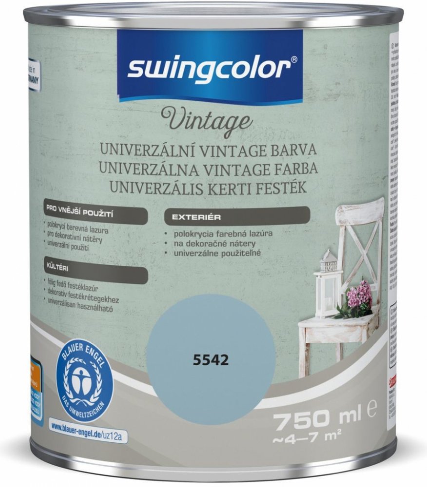 Univerzální barva značky Swingcolor je ochranná akrylátová barva na dřevo pro exteriér s vintage efektem. Částečně kryjící barevný email rychle schne a je odolný vůči povětrnostním vlivům a žloutnutí. Je vhodný na mnoho podkladů. Typickými oblastmi použití jsou například dekorativní předměty, květináče a zahradní nábytek. Lze jej použít na dřevo, terakotu, zinek, pozinkované povrchy a tvrzené PVC....