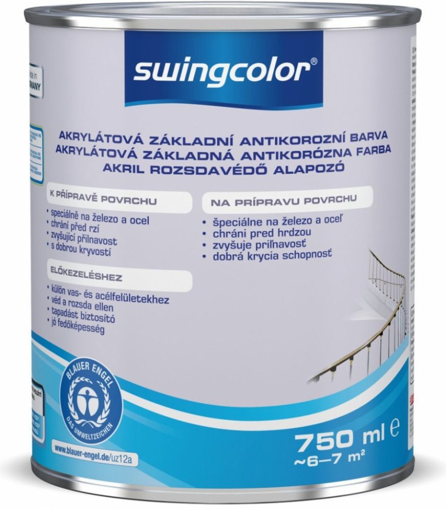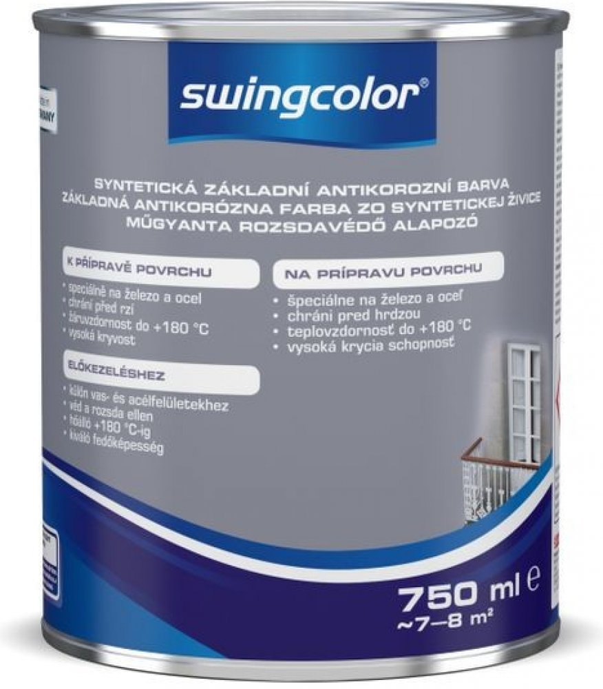 Základní antikorozní barvu swingcolor o objemu 750 ml v šedém odstínu na bázi syntetické pryskyřice a rozpouštědel využijete především na železné a ocelové povrchy v interiéru i exteriéru, jako jsou dveře, branky, ploty, zábradlí, kování, topná tělesa a další. Výborně kryje, účinně působí proti korozi a velmi dobře odolává vysokým teplotám až do 180 °C. Současně rychle schne, přetíratelná je již p...
