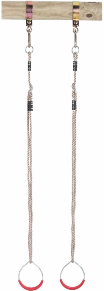 Gymnastické kruhy z kovu jsou výškově nastavitelné a mají příjemnou červenou plastovou rukojeť. Jednoduchá montáž se 2 houpačkovými háky (nejsou součástí dodávky). Pro výšku houpačky od 2,1 m do 2,55 m Průměr lana: 10 mm Upevnění vhodné pro průměr 10 cm.