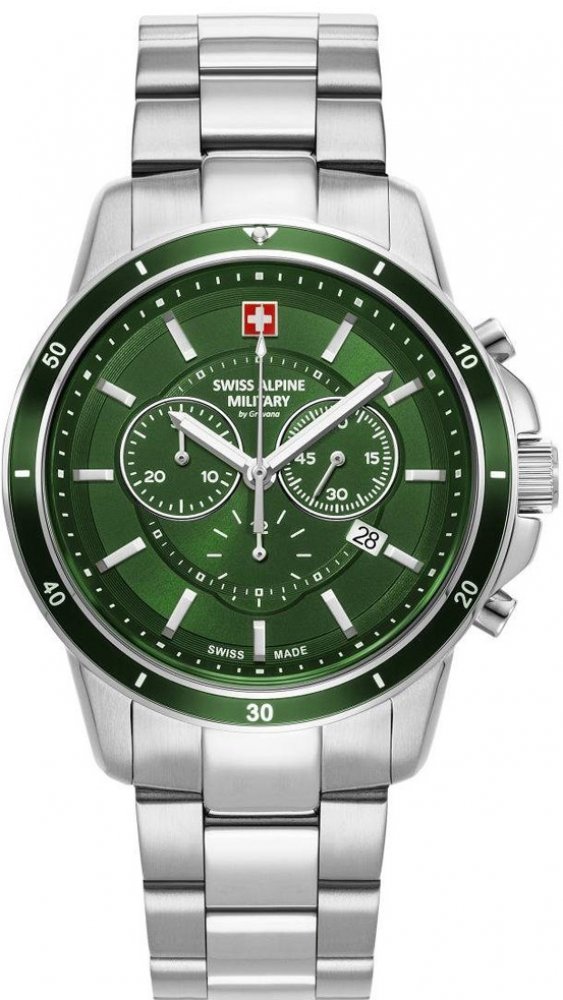 Swiss Alpine Military by Grovana analogové ocel sportovní pánské bateriové - quartz pro potápění (100+ m) 44.0 mm ocel 100 m bateriové 190 g minerální 26.5 cm bez osazení Chronograph 44mm kulaté stříbrná zelená s luminiscencí skládací spona 2.2 cm na ruku švýcarské bez číslic stříbrná ocel 4.4 cm střední s přesností 1/1 sekundy pevná 12.0 mm 22.0 mm 3 12.0 mm 44.0 mm s dočasným svícením (luminiscence/LED) s nenáročnou údržbou (quartz)