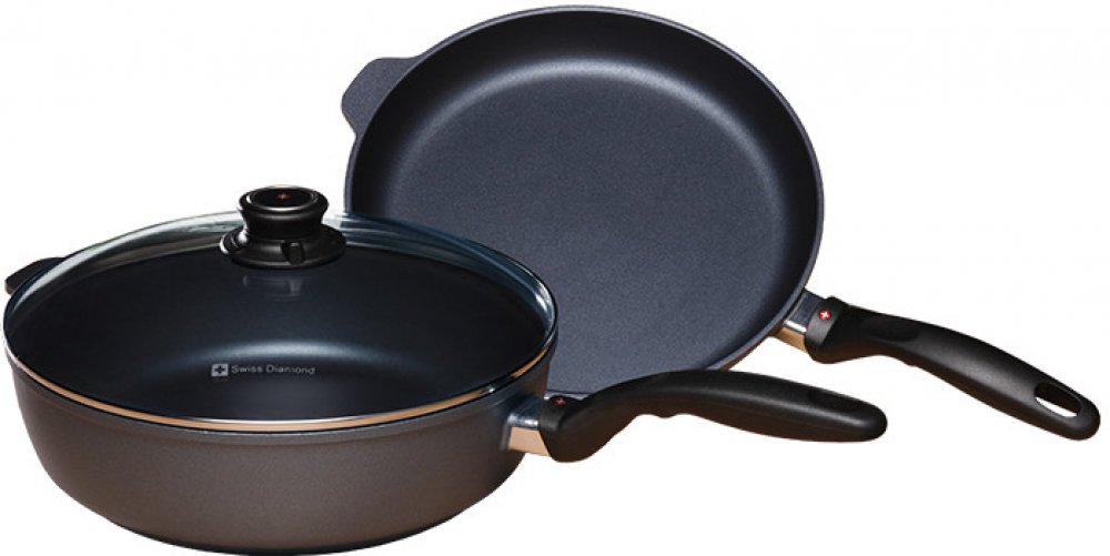 Naše 3 dílná sada Swiss Diamond® obsahuje zvýšenou pánev 28 cm s poklicí XD6728ic a nízkou pánev 28 cm XD6428i, na kterou pasuje poklice ze zvýšené.