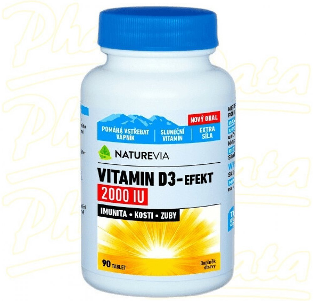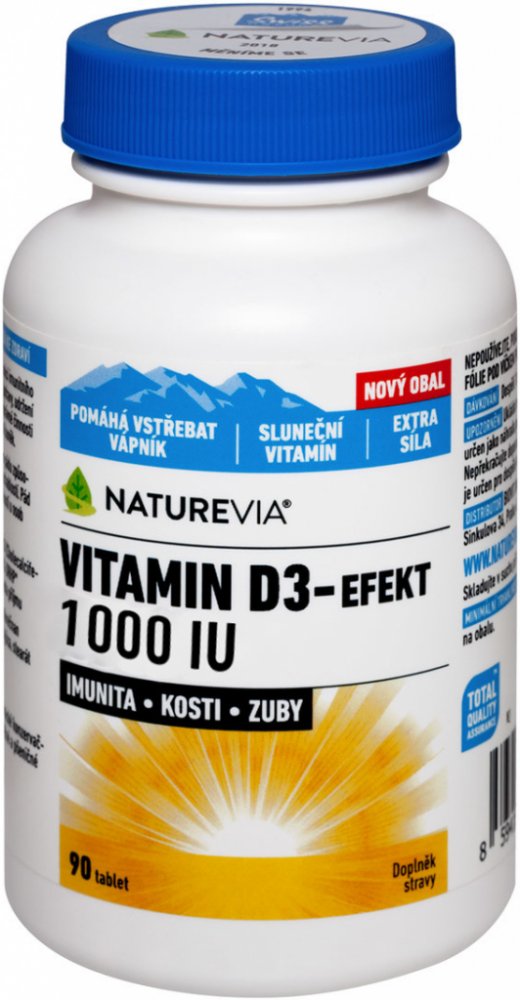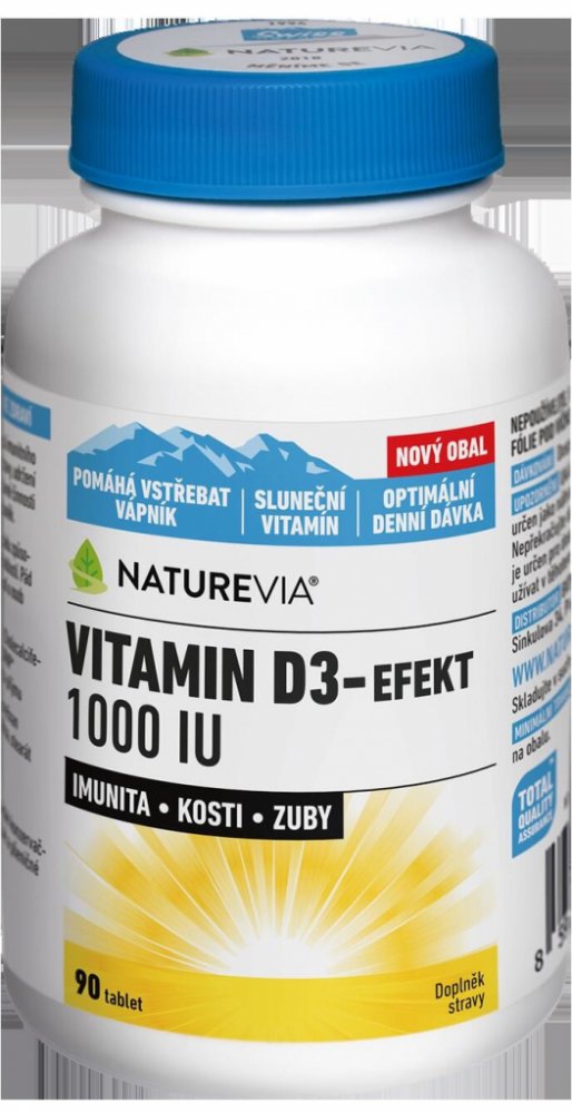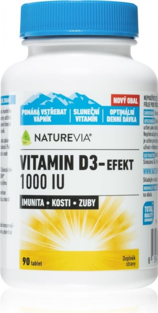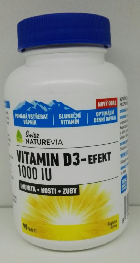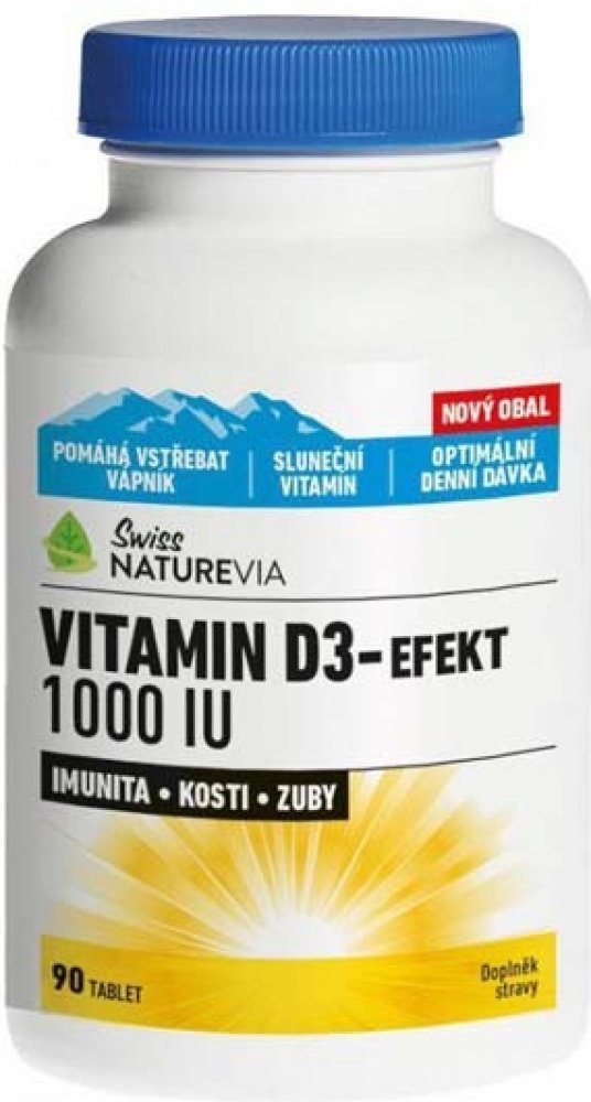 Doplněk stravy Swiss NatureVia Vitamin D3 Efekt je doplněk stravy obsahující vitamín D, který podporuje správnou funkci imunitního systému, pomáhá udržovat zdraví kostí a zubů přispívá k udržení normální činnosti svalů. Schopnost vytvářet vitamín D v pokožce klesá s věkem a denní příjem ze stravy pokrývá 10-20% naší denní potřeby. Doporučuje se užívat v průběhu celého roku.