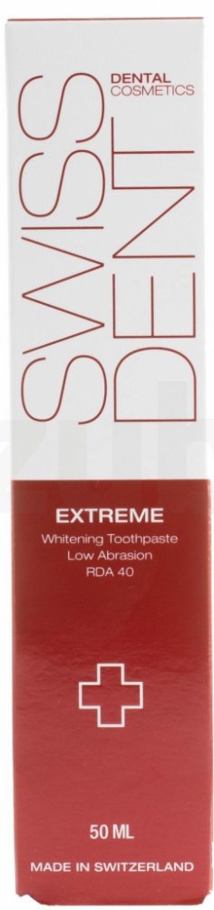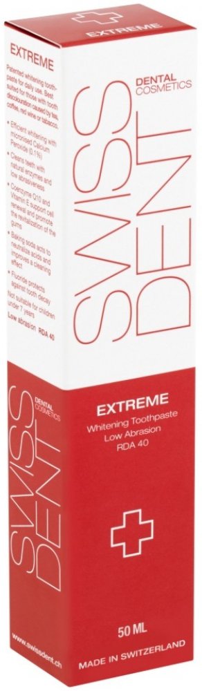 Zubní pasta Extreme s extrémně účinnou formulí je určena pro bělení velmi zabarvených zubů kuřáků nebo milovníků červeného vína, kávy a čaje. Hodnota abrazivity 40 RDA je sice téměř dvojnásobná než u
