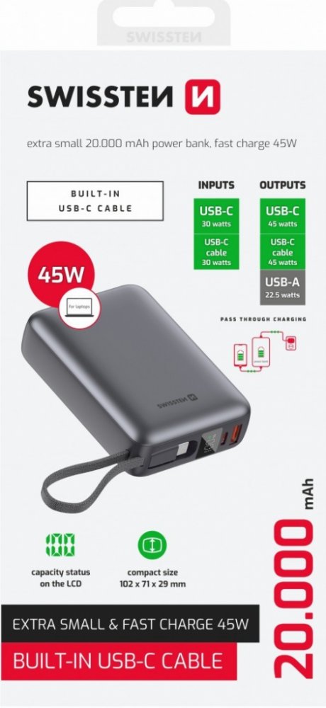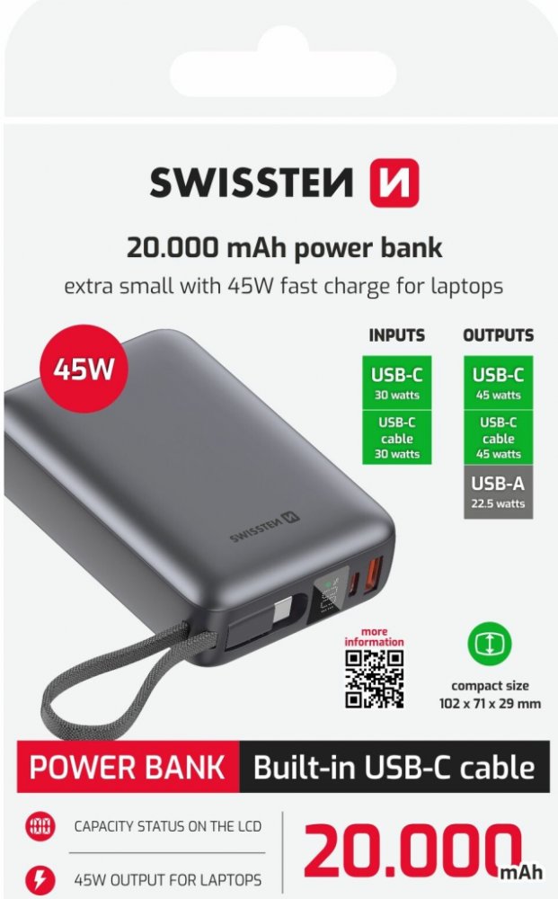 Hledáte výkonnou powerbanku, která zvládne napájet nejen váš smartphone, ale i notebook? Našli jste správně! SWISSTEN POWER BANK 20000 mAh 45W s integrovaným USB-C kabelem je ideálním řešením pro všechny, kdo potřebují dostatek energie na cestách.