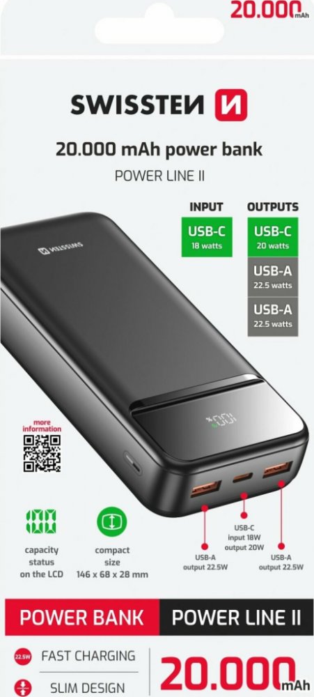 Hledáte kvalitní powerbanku, díky které již nebudete muset řešit problémy s nedostatkem energie pro Vaše zařízení? Našli jste správně! Power banka SWISSTEN s kapacitou 20.000 mAh, která vás nenechá bez energie ani na cestách. Její kompaktní design a LED displej pro snadnou kontrolu stavu baterie z ní dělají praktického společníka pro každodenní používání. Navíc nabízí široké možnosti nabíjení díky více výstupům a rychlému nabíjení.