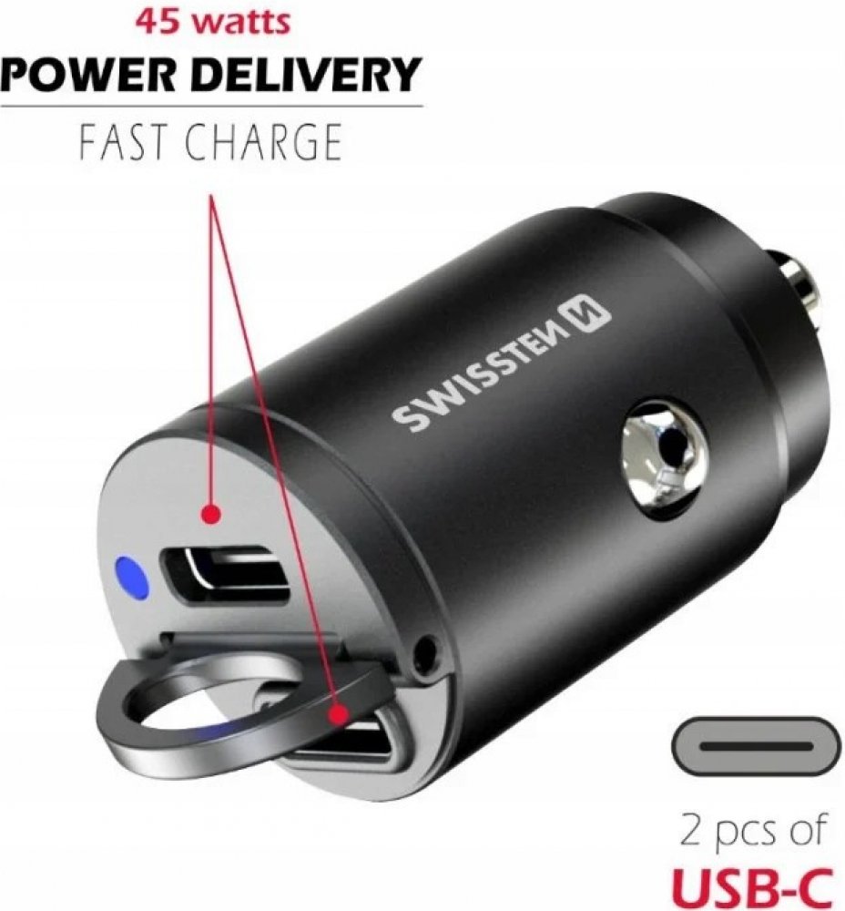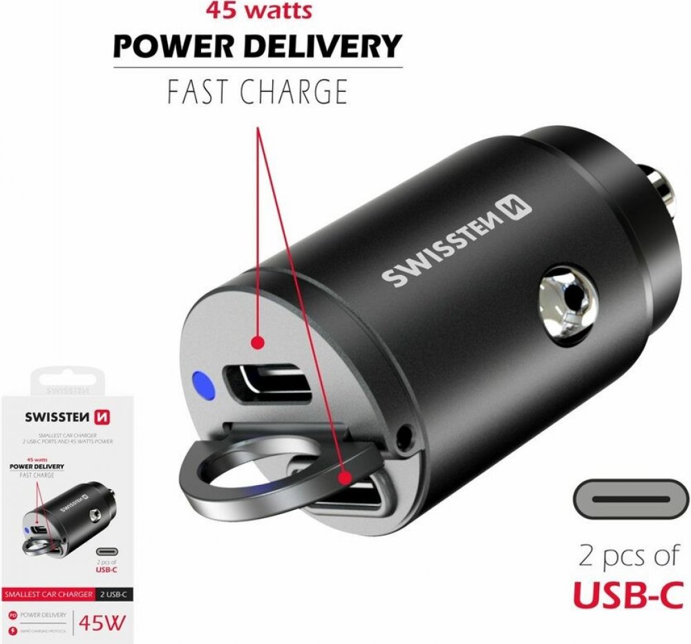 Hledáte způsob, jak v autě dobíjet svůj mobil i další přístroje? V tom případě se vám bezpochyby bude hodit nabíječka do auta Swissten. Je kompatibilní se zařízeními Android a iPhone. Tato nabíječka vám nabídne celkem 2 výstupy typu USB-C o výkonu maximálně 45 W. Své zařízení budete schopni dobíjet díky portu 2× USB-C (45 W). Nabíječka do auta je typická současným designem, který dotváří černá bar...