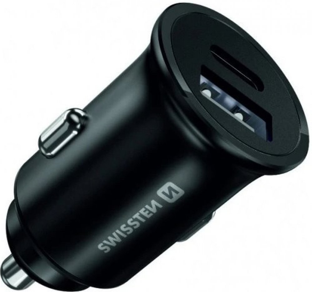 SWISSTEN 20119100 Napájecí adaptér, do auta, 1× USB-C, 1× USB, vstup 12–24V, 30W (celkem), PD 3.0, pro Apple iPhone 12, černý 20119100