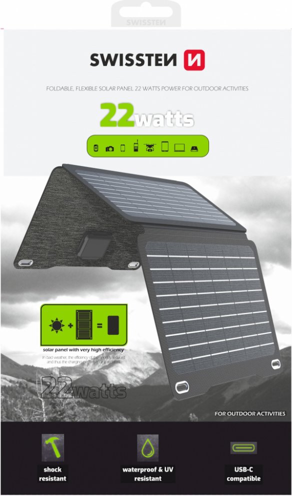 Solární panel skládací 22W SWISSTEN Solární panel skládací 22W značky SWISSTEN je výkonné, lehké a přenosné zařízení ideální pro nabíjení telefonů a další elektroniky mimo dosah sítě. Monokrystalické články poskytují vysokou účinnost, zatímco vodotěsné provedení IP67 zajistí bezpečné použití i v náročných podmínkách. Panel disponuje výstupy USB-C i USB-A a dokáže současně nabíjet více zařízení. Díky skládací konstrukci z odolného plastu ETFE je ideální pro cestování, kempování nebo outdoorová dobrodružství. Kompaktní rozměry a jednoduché použití z něj dělají skvělého parťáka na cesty. Hlavní výhody solárního panelu: vysoká účinnost monokrystalických článků lehký, skladný a odolný design vodotěsné provedení panelu dle IP67 možnost nabíjení více zařízení přes USB-C a USB-A ekologické využití solární energie ideální pro cestování, kempování a outdoor Parametry solárního panelu: maximální výkon: 22W typ článků: monokrystalický materiál: plast ETFE výstup USB-C: 5V DC 3A / max. 15W výstup USB-A: 5V DC 3A / max. 15W při současném použití USB-C a USB-A: max. celkem 15W krytí panelu: IP67 krytí nabíjecího boxu: není vodotěsný rozměry rozloženého panelu: 63 × 29 × 2 cm rozměry složeného panelu: 29 × 21 × 3 cm hmotnost: 650 g Obsah balení solárního panelu: skládací solární panel Swissten 22W Oblast použití solárního panelu: nabíjení mobilních zařízení na cestách ideální pro turistiku, kemping a expedice ekologické řešení pro přenosné napájení