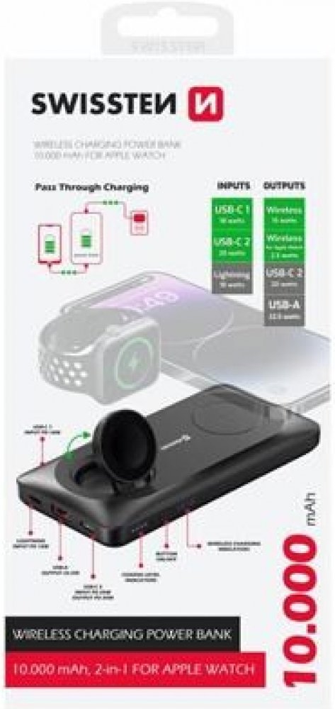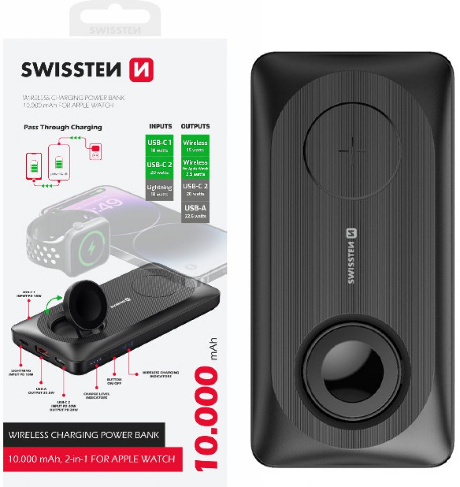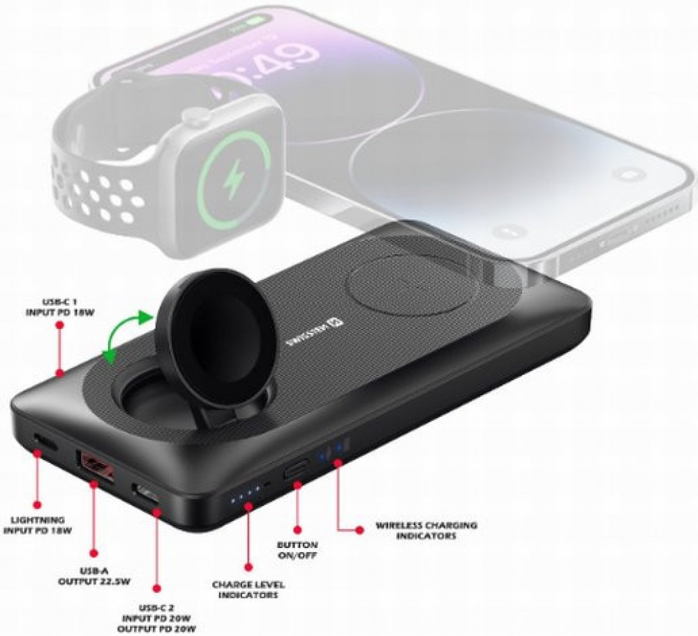 Powerbanka disponuje dvěma bezdrátovými výstupy. Jeden je určen pro chytré hodinky Apple Watch s výstupním výkonem 2,5W a druhý pro smartphony s výstupním výkonem až 15W.