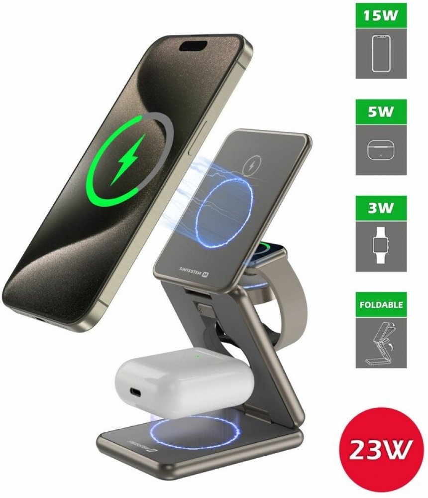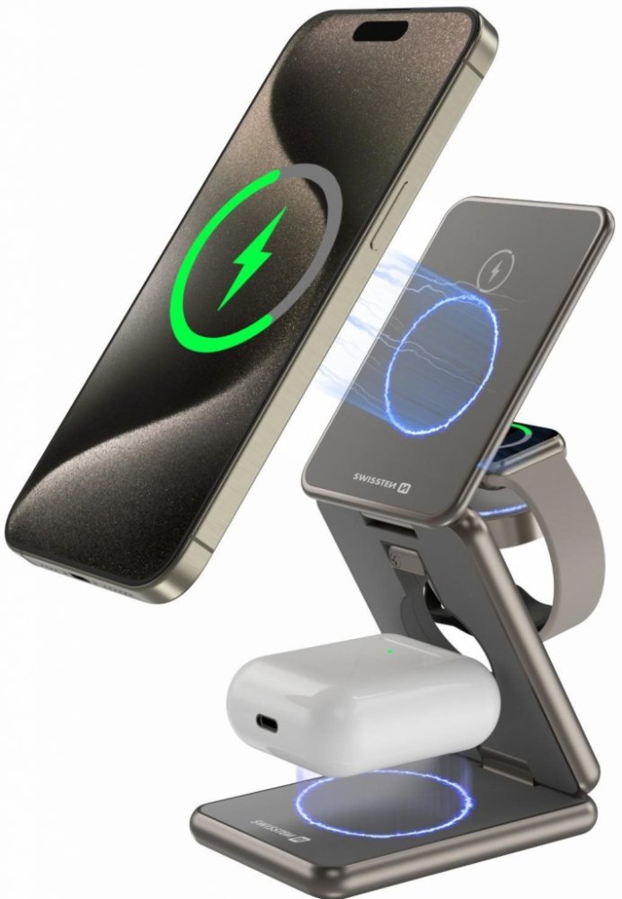 Díky funkci nabíjet až 3 zařízení najednou, již nebudete mít problémy s nedostatkem energie ve vašich zařízeních. Pohodlně na nabíječce nabijete telefon, hodinky a sluchátka s podporou bezdrátového nabíjení.